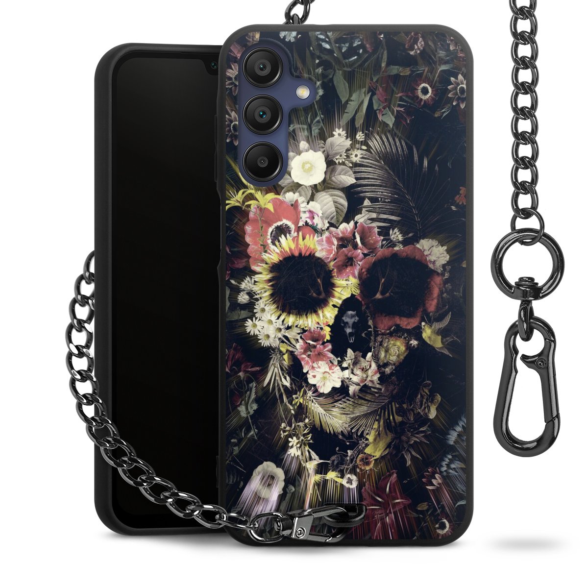 Die mattschwarze Silikon-Handyhülle besteht aus robustem TPU (thermoplastisches Polyurethan). Sie ist flexibel und schützt Dein Smartphone vor Stößen und Kratzern. Die Kette sowie der Karabinerhaken sind aus Metall in Gunmetal-Optik gefertigt. Für dieses Produkt kommen ausschließlich TÜV-geprüfte Materialien zum Einsatz.