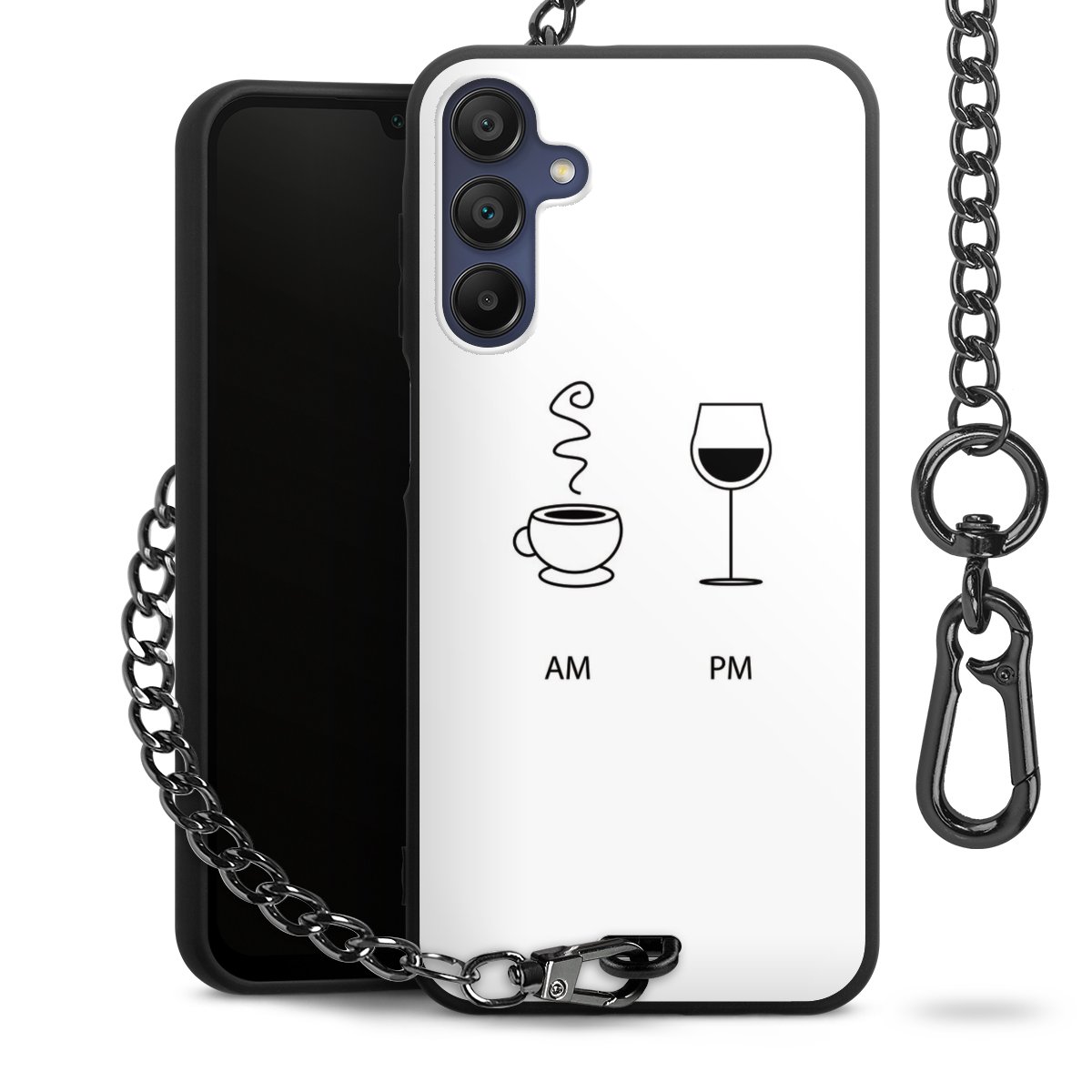 Die mattschwarze Silikon-Handyhülle besteht aus robustem TPU (thermoplastisches Polyurethan). Sie ist flexibel und schützt Dein Smartphone vor Stößen und Kratzern. Die Kette sowie der Karabinerhaken sind aus Metall in Gunmetal-Optik gefertigt. Für dieses Produkt kommen ausschließlich TÜV-geprüfte Materialien zum Einsatz.