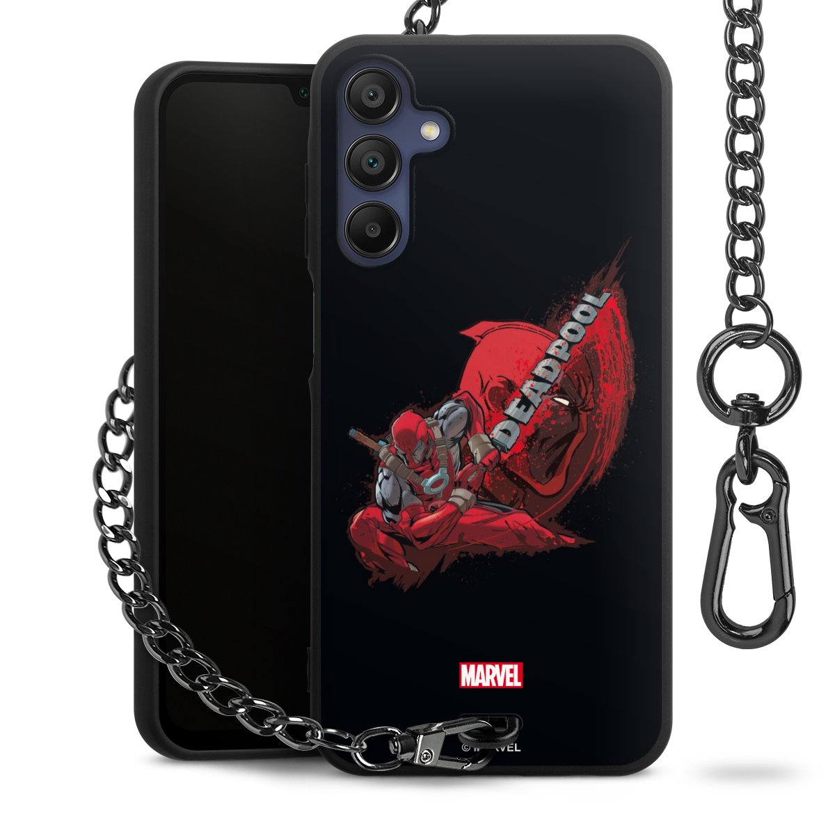 Die mattschwarze Silikon-Handyhülle besteht aus robustem TPU (thermoplastisches Polyurethan). Sie ist flexibel und schützt Dein Smartphone vor Stößen und Kratzern. Die Kette sowie der Karabinerhaken sind aus Metall in Gunmetal-Optik gefertigt. Für dieses Produkt kommen ausschließlich TÜV-geprüfte Materialien zum Einsatz.