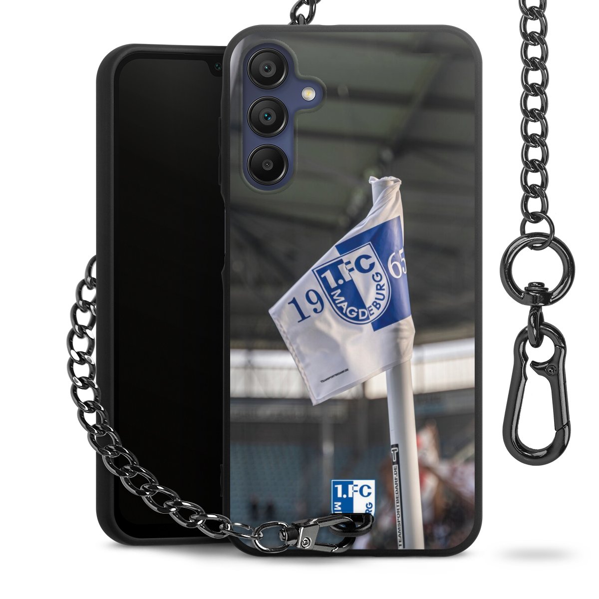 Die Handyhülle verfügt über eine mittig am unteren Rand platzierte Öse, an der die Metallkette stabil befestigt ist. Bestelle die Hülle einfach für Dein Smartphone-Modell, dann passt sie wie angegossen und Du brauchst sie bloß einmal anzudrücken. Handy in die Tasche, Karabiner an den Hosenbund – schon kann die Party starten.