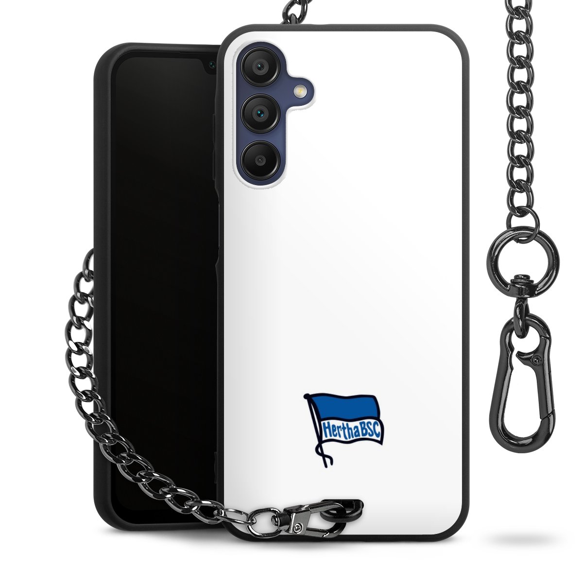 Die mattschwarze Silikon-Handyhülle besteht aus robustem TPU (thermoplastisches Polyurethan). Sie ist flexibel und schützt Dein Smartphone vor Stößen und Kratzern. Die Kette sowie der Karabinerhaken sind aus Metall in Gunmetal-Optik gefertigt. Für dieses Produkt kommen ausschließlich TÜV-geprüfte Materialien zum Einsatz.