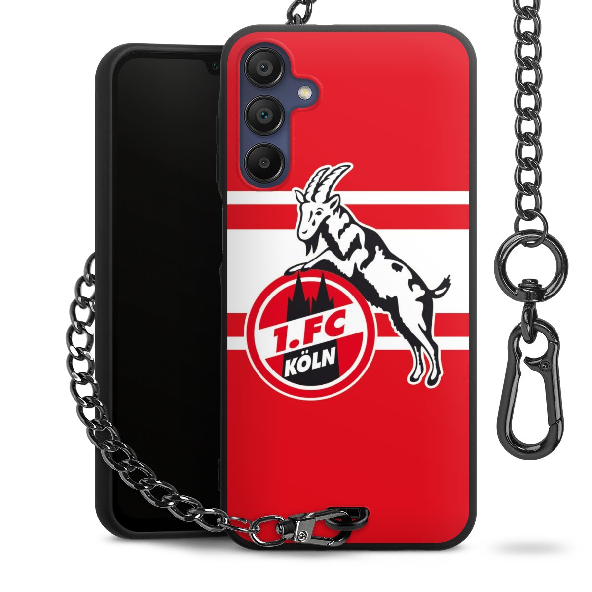 Die Handyhülle verfügt über eine mittig am unteren Rand platzierte Öse, an der die Metallkette stabil befestigt ist. Bestelle die Hülle einfach für Dein Smartphone-Modell, dann passt sie wie angegossen und Du brauchst sie bloß einmal anzudrücken. Handy in die Tasche, Karabiner an den Hosenbund – schon kann die Party starten.