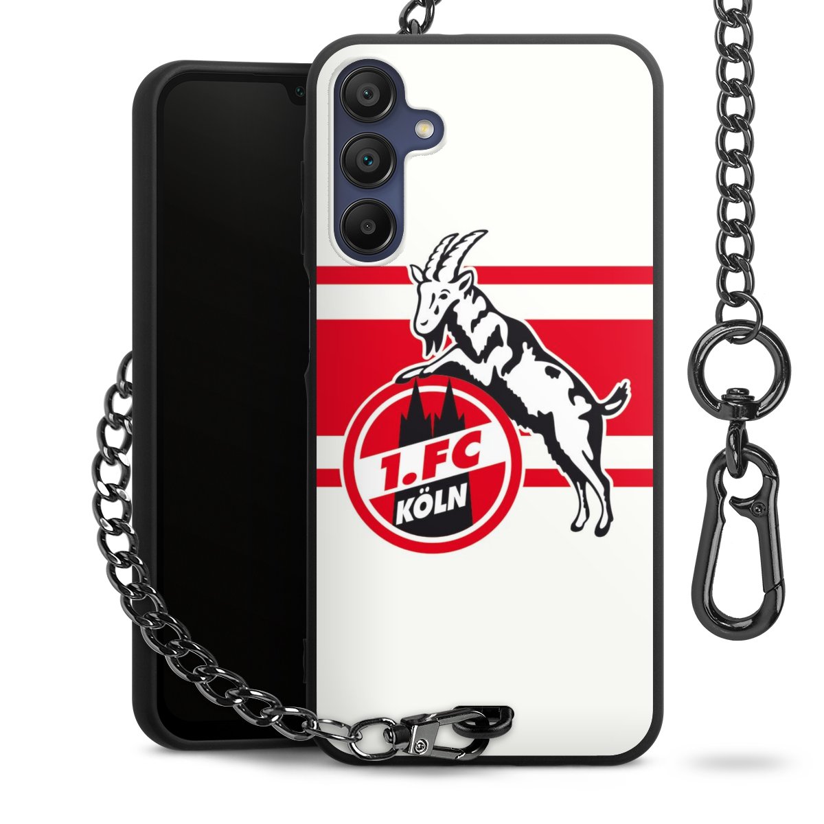 Die Handyhülle verfügt über eine mittig am unteren Rand platzierte Öse, an der die Metallkette stabil befestigt ist. Bestelle die Hülle einfach für Dein Smartphone-Modell, dann passt sie wie angegossen und Du brauchst sie bloß einmal anzudrücken. Handy in die Tasche, Karabiner an den Hosenbund – schon kann die Party starten.