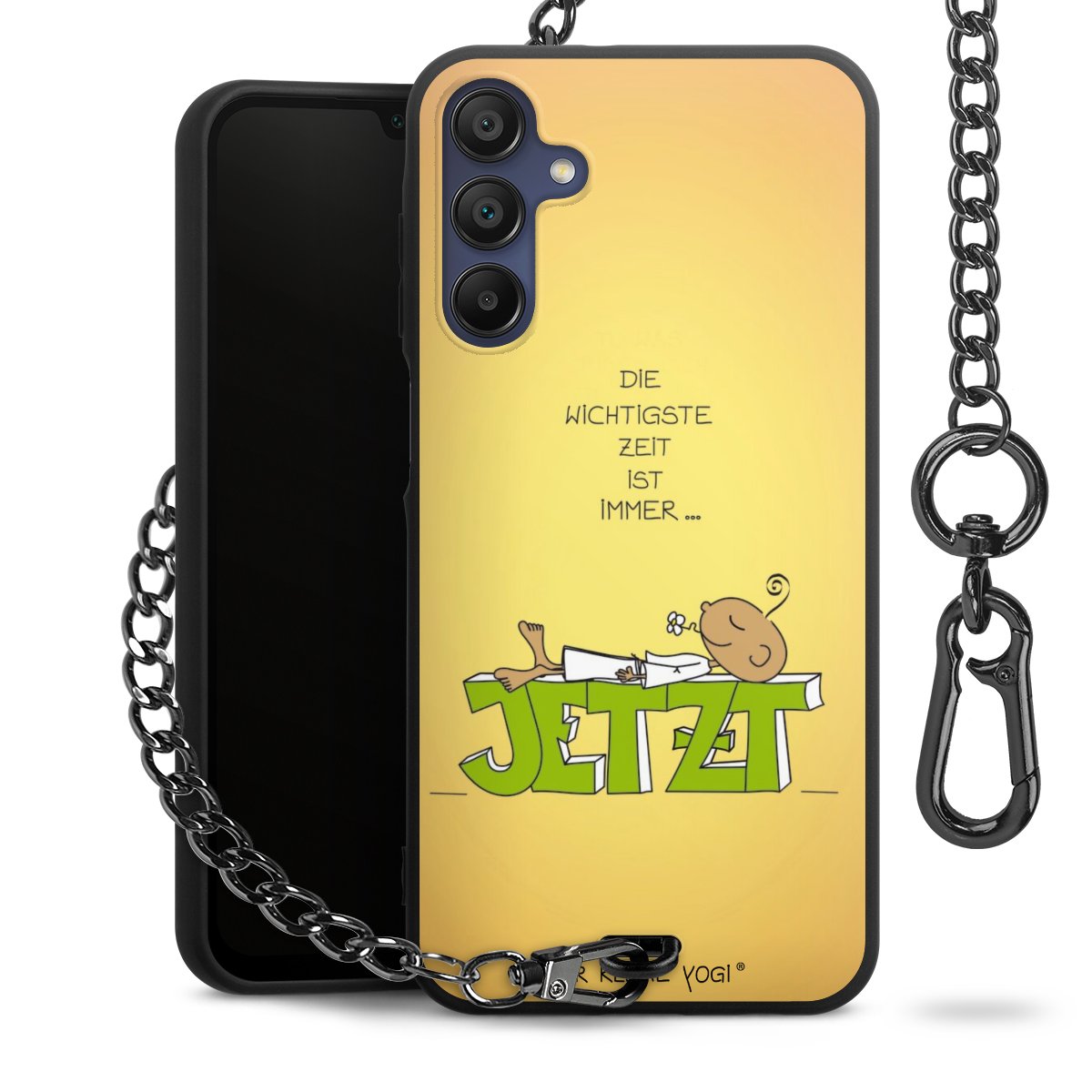 Die Handyhülle verfügt über eine mittig am unteren Rand platzierte Öse, an der die Metallkette stabil befestigt ist. Bestelle die Hülle einfach für Dein Smartphone-Modell, dann passt sie wie angegossen und Du brauchst sie bloß einmal anzudrücken. Handy in die Tasche, Karabiner an den Hosenbund – schon kann die Party starten.