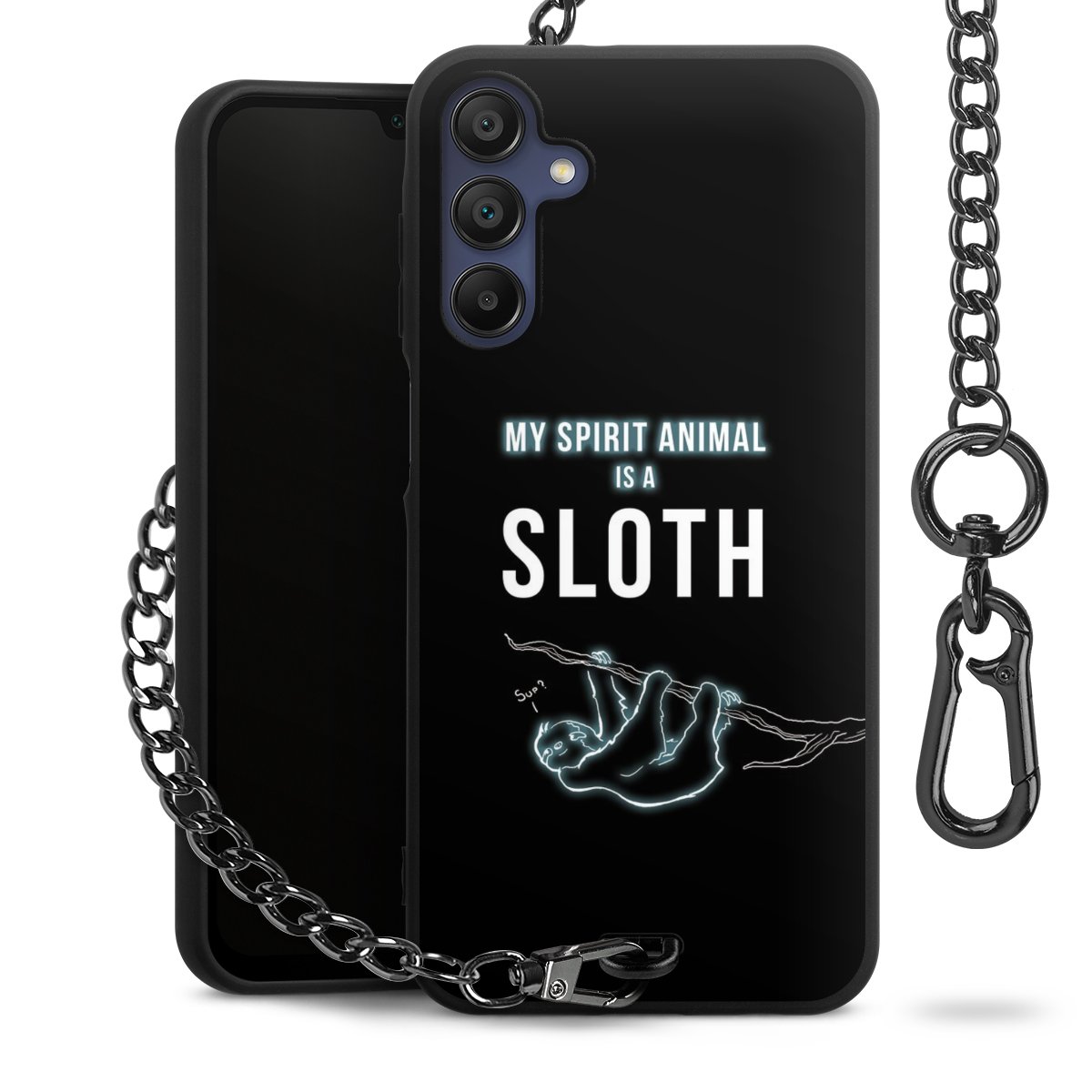 Die mattschwarze Silikon-Handyhülle besteht aus robustem TPU (thermoplastisches Polyurethan). Sie ist flexibel und schützt Dein Smartphone vor Stößen und Kratzern. Die Kette sowie der Karabinerhaken sind aus Metall in Gunmetal-Optik gefertigt. Für dieses Produkt kommen ausschließlich TÜV-geprüfte Materialien zum Einsatz.