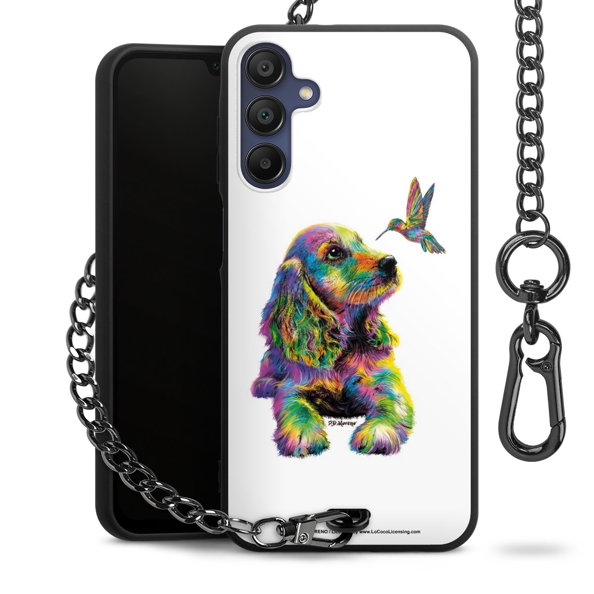 Die Handyhülle verfügt über eine mittig am unteren Rand platzierte Öse, an der die Metallkette stabil befestigt ist. Bestelle die Hülle einfach für Dein Smartphone-Modell, dann passt sie wie angegossen und Du brauchst sie bloß einmal anzudrücken. Handy in die Tasche, Karabiner an den Hosenbund – schon kann die Party starten.