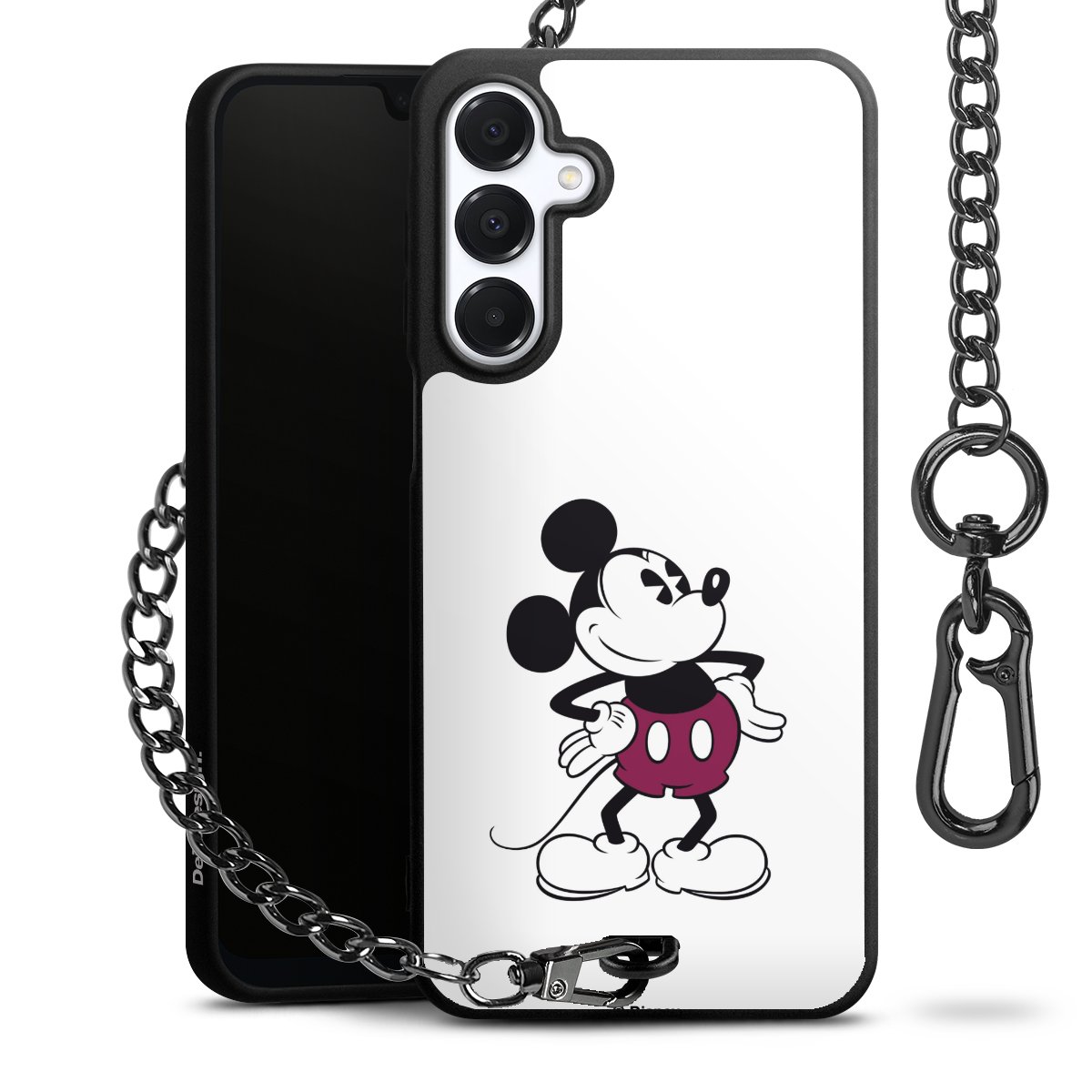 Die Handyhülle verfügt über eine mittig am unteren Rand platzierte Öse, an der die Metallkette stabil befestigt ist. Bestelle die Hülle einfach für Dein Smartphone-Modell, dann passt sie wie angegossen und Du brauchst sie bloß einmal anzudrücken. Handy in die Tasche, Karabiner an den Hosenbund – schon kann die Party starten.