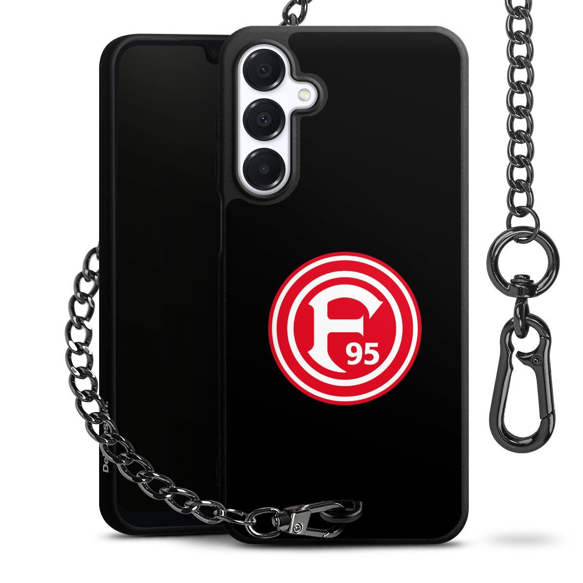 Die Handyhülle verfügt über eine mittig am unteren Rand platzierte Öse, an der die Metallkette stabil befestigt ist. Bestelle die Hülle einfach für Dein Smartphone-Modell, dann passt sie wie angegossen und Du brauchst sie bloß einmal anzudrücken. Handy in die Tasche, Karabiner an den Hosenbund – schon kann die Party starten.