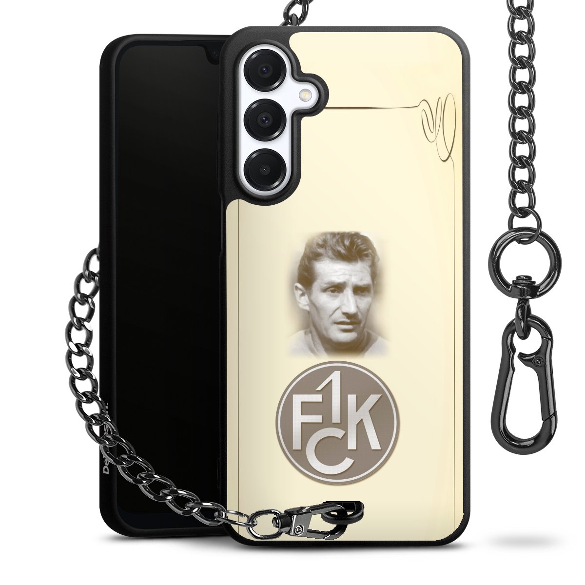 Die Handyhülle verfügt über eine mittig am unteren Rand platzierte Öse, an der die Metallkette stabil befestigt ist. Bestelle die Hülle einfach für Dein Smartphone-Modell, dann passt sie wie angegossen und Du brauchst sie bloß einmal anzudrücken. Handy in die Tasche, Karabiner an den Hosenbund – schon kann die Party starten.