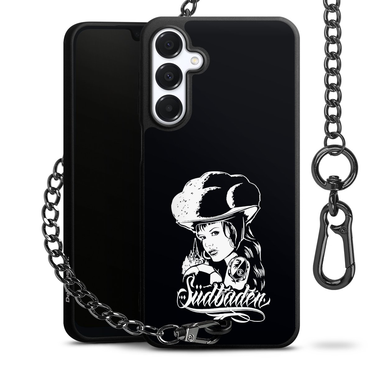 Die mattschwarze Silikon-Handyhülle besteht aus robustem TPU (thermoplastisches Polyurethan). Sie ist flexibel und schützt Dein Smartphone vor Stößen und Kratzern. Die Kette sowie der Karabinerhaken sind aus Metall in Gunmetal-Optik gefertigt. Für dieses Produkt kommen ausschließlich TÜV-geprüfte Materialien zum Einsatz.
