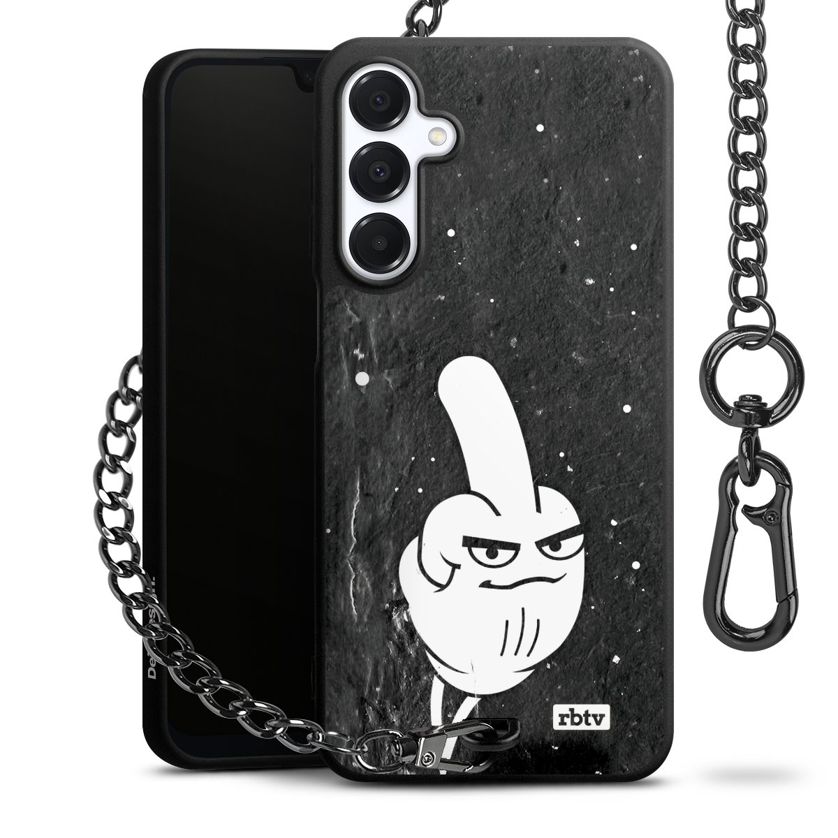 Die mattschwarze Silikon-Handyhülle besteht aus robustem TPU (thermoplastisches Polyurethan). Sie ist flexibel und schützt Dein Smartphone vor Stößen und Kratzern. Die Kette sowie der Karabinerhaken sind aus Metall in Gunmetal-Optik gefertigt. Für dieses Produkt kommen ausschließlich TÜV-geprüfte Materialien zum Einsatz.