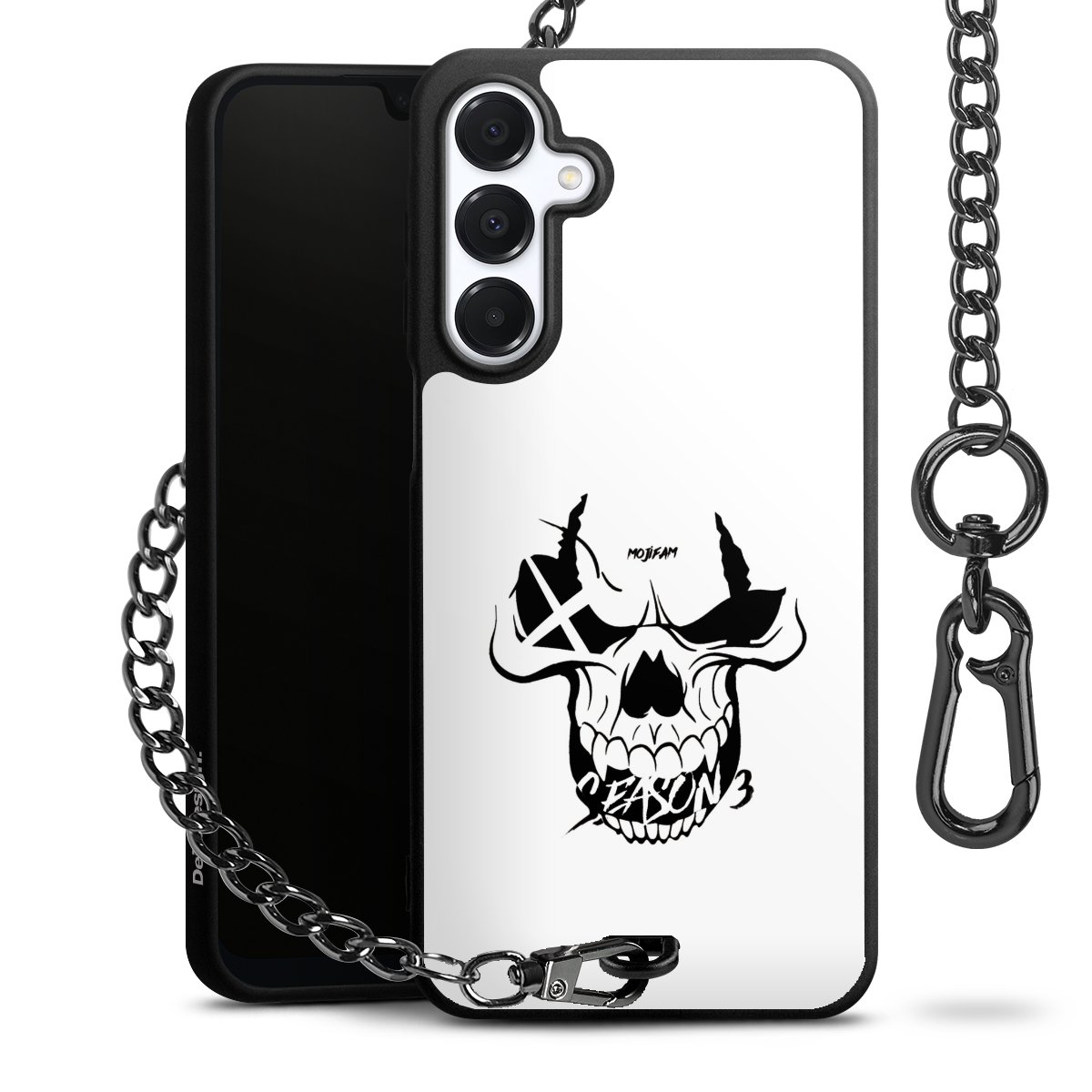 Die mattschwarze Silikon-Handyhülle besteht aus robustem TPU (thermoplastisches Polyurethan). Sie ist flexibel und schützt Dein Smartphone vor Stößen und Kratzern. Die Kette sowie der Karabinerhaken sind aus Metall in Gunmetal-Optik gefertigt. Für dieses Produkt kommen ausschließlich TÜV-geprüfte Materialien zum Einsatz.