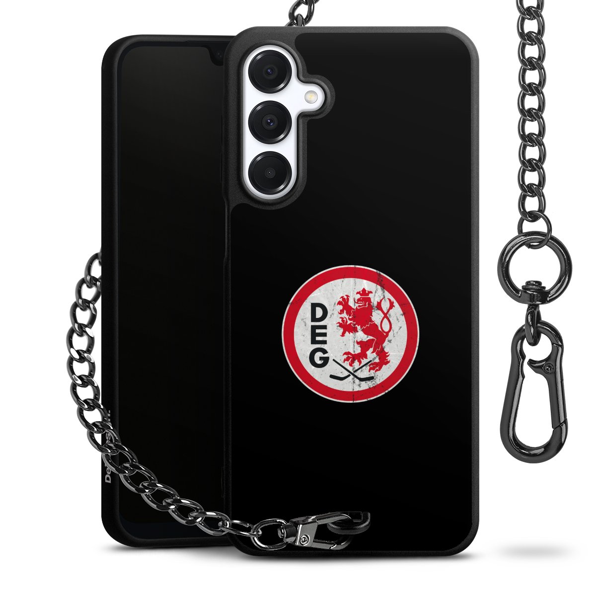 Die mattschwarze Silikon-Handyhülle besteht aus robustem TPU (thermoplastisches Polyurethan). Sie ist flexibel und schützt Dein Smartphone vor Stößen und Kratzern. Die Kette sowie der Karabinerhaken sind aus Metall in Gunmetal-Optik gefertigt. Für dieses Produkt kommen ausschließlich TÜV-geprüfte Materialien zum Einsatz.