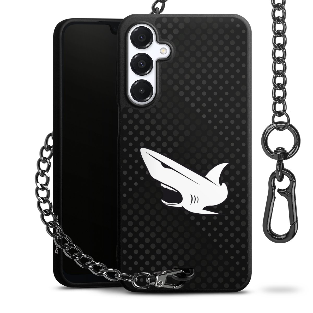 Die mattschwarze Silikon-Handyhülle besteht aus robustem TPU (thermoplastisches Polyurethan). Sie ist flexibel und schützt Dein Smartphone vor Stößen und Kratzern. Die Kette sowie der Karabinerhaken sind aus Metall in Gunmetal-Optik gefertigt. Für dieses Produkt kommen ausschließlich TÜV-geprüfte Materialien zum Einsatz.