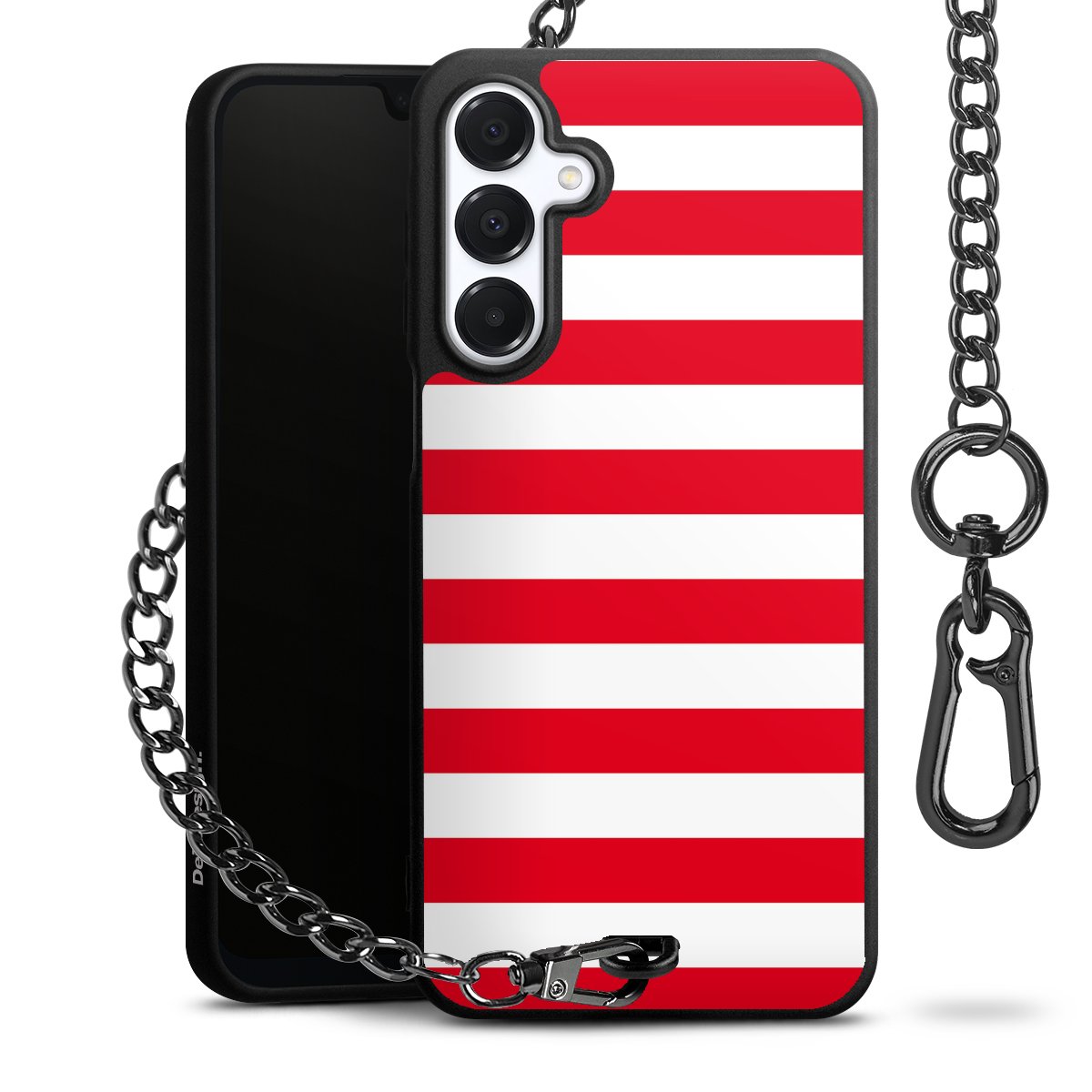 Die mattschwarze Silikon-Handyhülle besteht aus robustem TPU (thermoplastisches Polyurethan). Sie ist flexibel und schützt Dein Smartphone vor Stößen und Kratzern. Die Kette sowie der Karabinerhaken sind aus Metall in Gunmetal-Optik gefertigt. Für dieses Produkt kommen ausschließlich TÜV-geprüfte Materialien zum Einsatz.