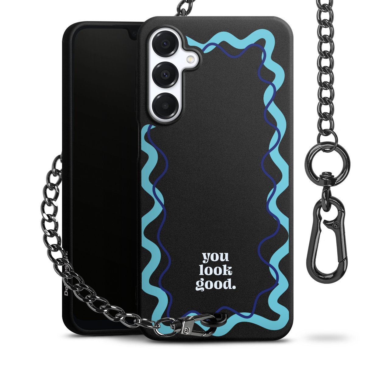 Die mattschwarze Silikon-Handyhülle besteht aus robustem TPU (thermoplastisches Polyurethan). Sie ist flexibel und schützt Dein Smartphone vor Stößen und Kratzern. Die Kette sowie der Karabinerhaken sind aus Metall in Gunmetal-Optik gefertigt. Für dieses Produkt kommen ausschließlich TÜV-geprüfte Materialien zum Einsatz.