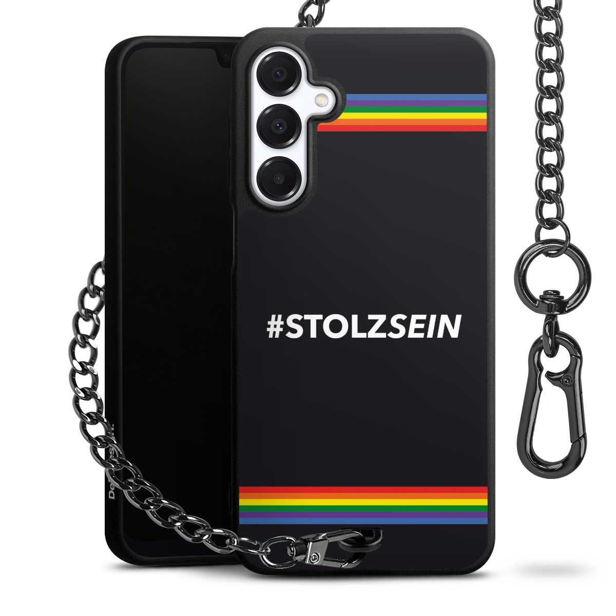 Die mattschwarze Silikon-Handyhülle besteht aus robustem TPU (thermoplastisches Polyurethan). Sie ist flexibel und schützt Dein Smartphone vor Stößen und Kratzern. Die Kette sowie der Karabinerhaken sind aus Metall in Gunmetal-Optik gefertigt. Für dieses Produkt kommen ausschließlich TÜV-geprüfte Materialien zum Einsatz.