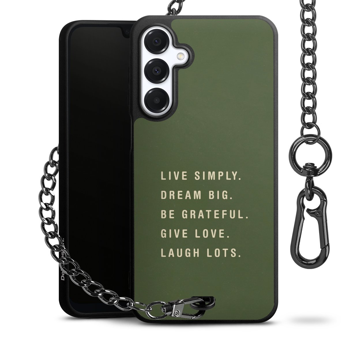 Die mattschwarze Silikon-Handyhülle besteht aus robustem TPU (thermoplastisches Polyurethan). Sie ist flexibel und schützt Dein Smartphone vor Stößen und Kratzern. Die Kette sowie der Karabinerhaken sind aus Metall in Gunmetal-Optik gefertigt. Für dieses Produkt kommen ausschließlich TÜV-geprüfte Materialien zum Einsatz.