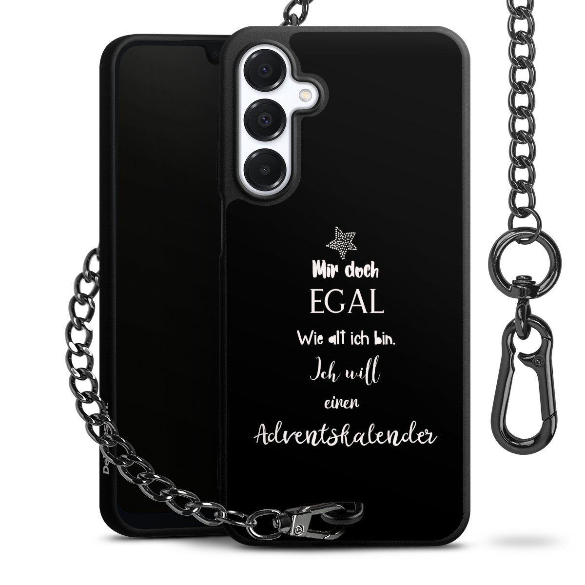 Die mattschwarze Silikon-Handyhülle besteht aus robustem TPU (thermoplastisches Polyurethan). Sie ist flexibel und schützt Dein Smartphone vor Stößen und Kratzern. Die Kette sowie der Karabinerhaken sind aus Metall in Gunmetal-Optik gefertigt. Für dieses Produkt kommen ausschließlich TÜV-geprüfte Materialien zum Einsatz.