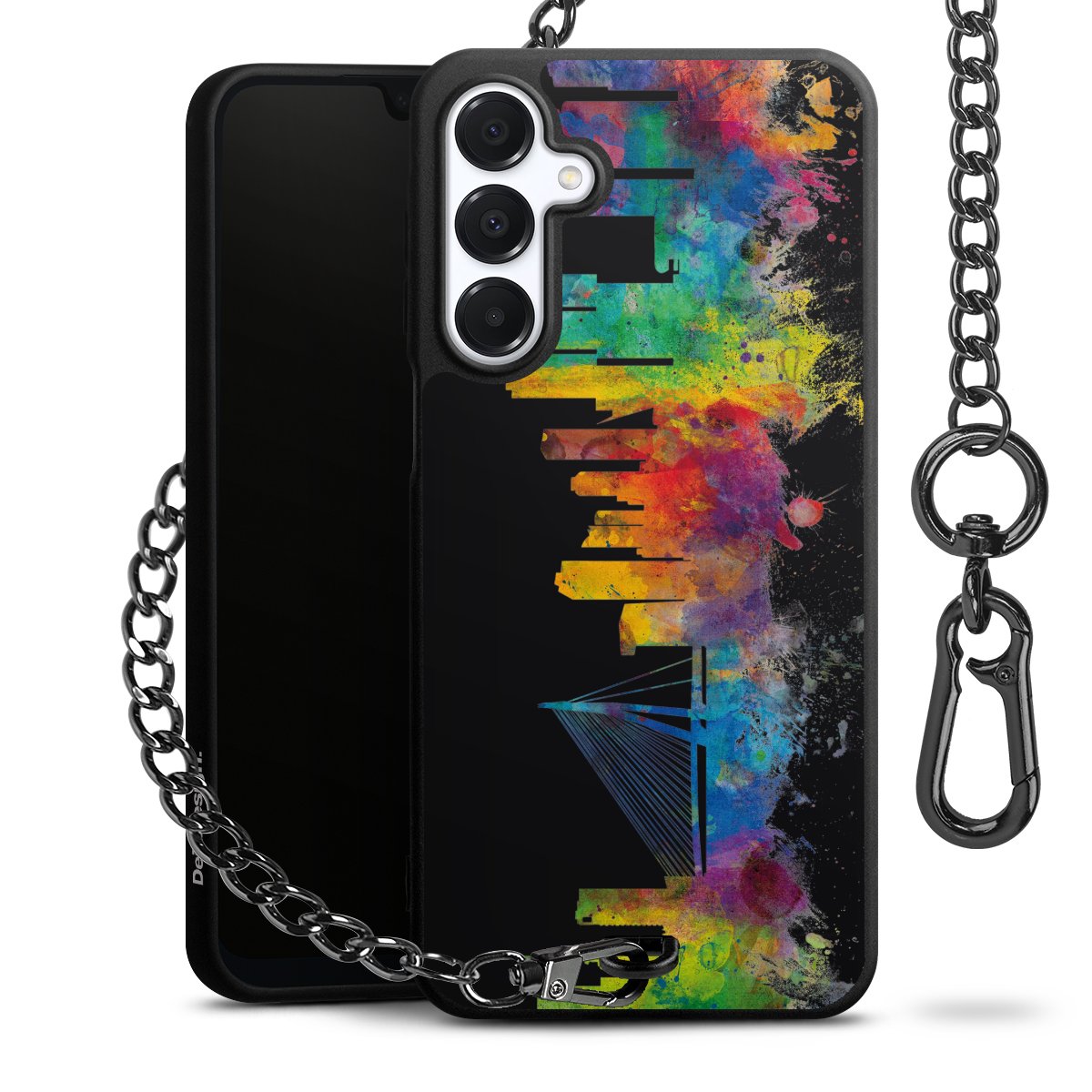 Die mattschwarze Silikon-Handyhülle besteht aus robustem TPU (thermoplastisches Polyurethan). Sie ist flexibel und schützt Dein Smartphone vor Stößen und Kratzern. Die Kette sowie der Karabinerhaken sind aus Metall in Gunmetal-Optik gefertigt. Für dieses Produkt kommen ausschließlich TÜV-geprüfte Materialien zum Einsatz.