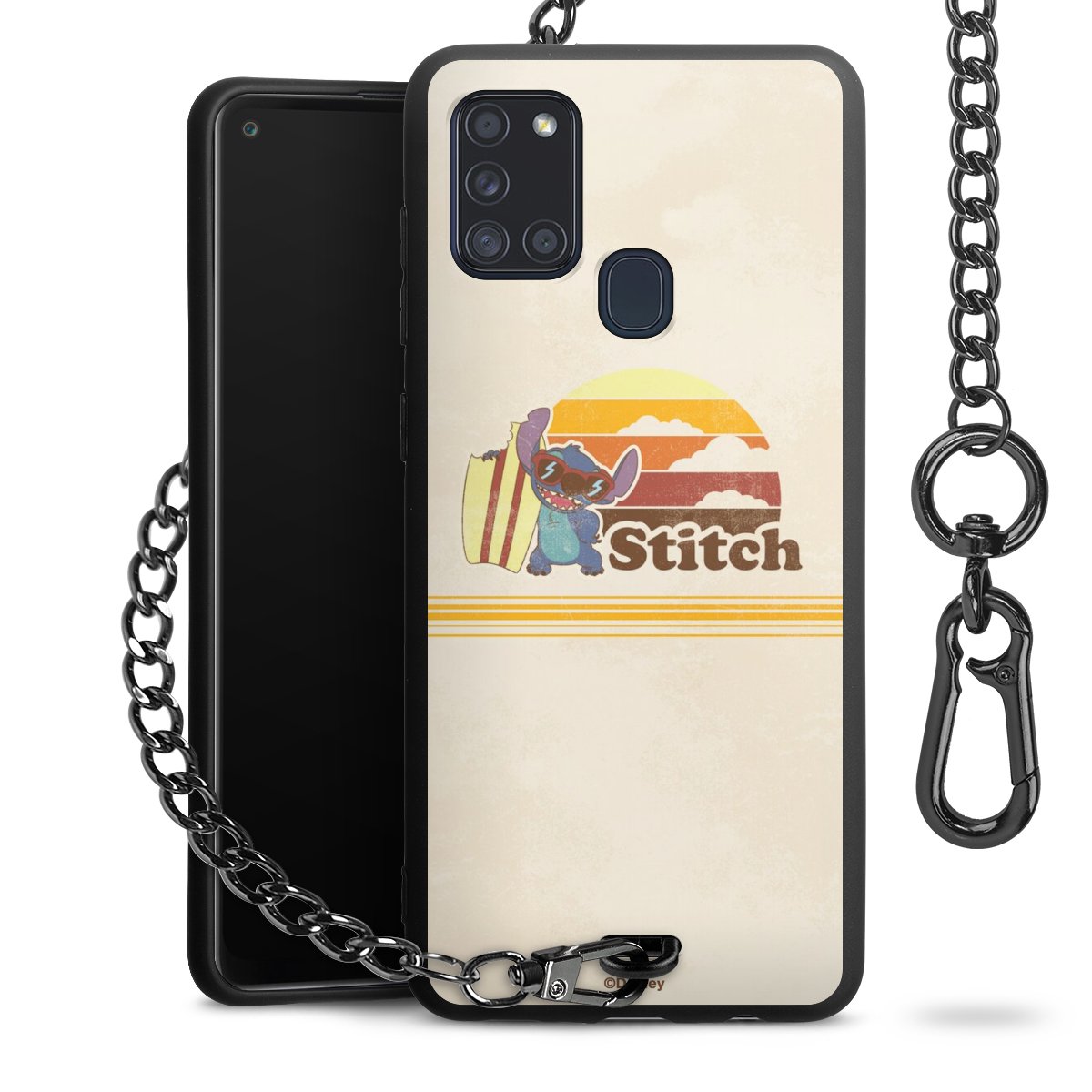 Die Handyhülle verfügt über eine mittig am unteren Rand platzierte Öse, an der die Metallkette stabil befestigt ist. Bestelle die Hülle einfach für Dein Smartphone-Modell, dann passt sie wie angegossen und Du brauchst sie bloß einmal anzudrücken. Handy in die Tasche, Karabiner an den Hosenbund – schon kann die Party starten.