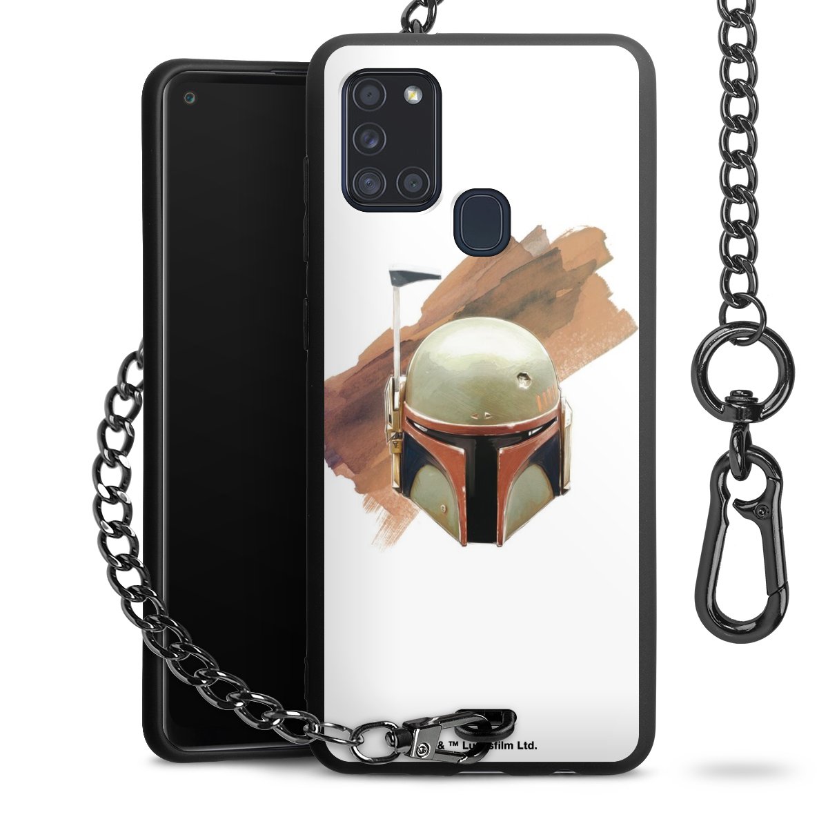 Die Handyhülle verfügt über eine mittig am unteren Rand platzierte Öse, an der die Metallkette stabil befestigt ist. Bestelle die Hülle einfach für Dein Smartphone-Modell, dann passt sie wie angegossen und Du brauchst sie bloß einmal anzudrücken. Handy in die Tasche, Karabiner an den Hosenbund – schon kann die Party starten.