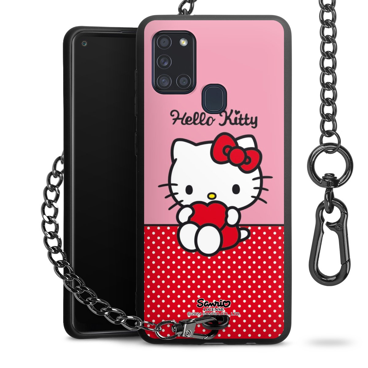 Die Handyhülle verfügt über eine mittig am unteren Rand platzierte Öse, an der die Metallkette stabil befestigt ist. Bestelle die Hülle einfach für Dein Smartphone-Modell, dann passt sie wie angegossen und Du brauchst sie bloß einmal anzudrücken. Handy in die Tasche, Karabiner an den Hosenbund – schon kann die Party starten.