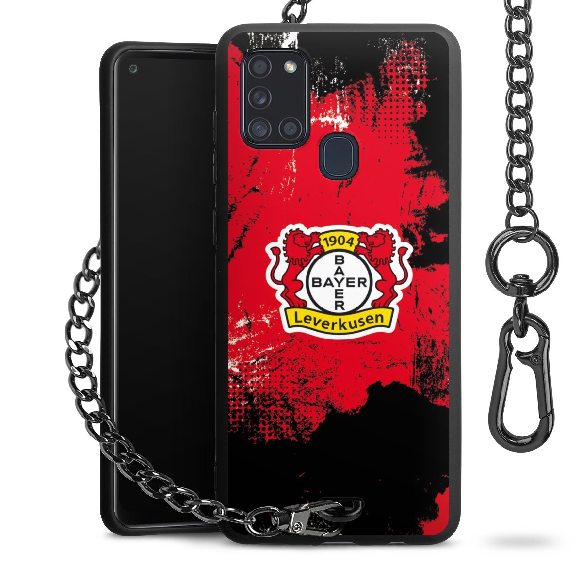 Die Handyhülle verfügt über eine mittig am unteren Rand platzierte Öse, an der die Metallkette stabil befestigt ist. Bestelle die Hülle einfach für Dein Smartphone-Modell, dann passt sie wie angegossen und Du brauchst sie bloß einmal anzudrücken. Handy in die Tasche, Karabiner an den Hosenbund – schon kann die Party starten.