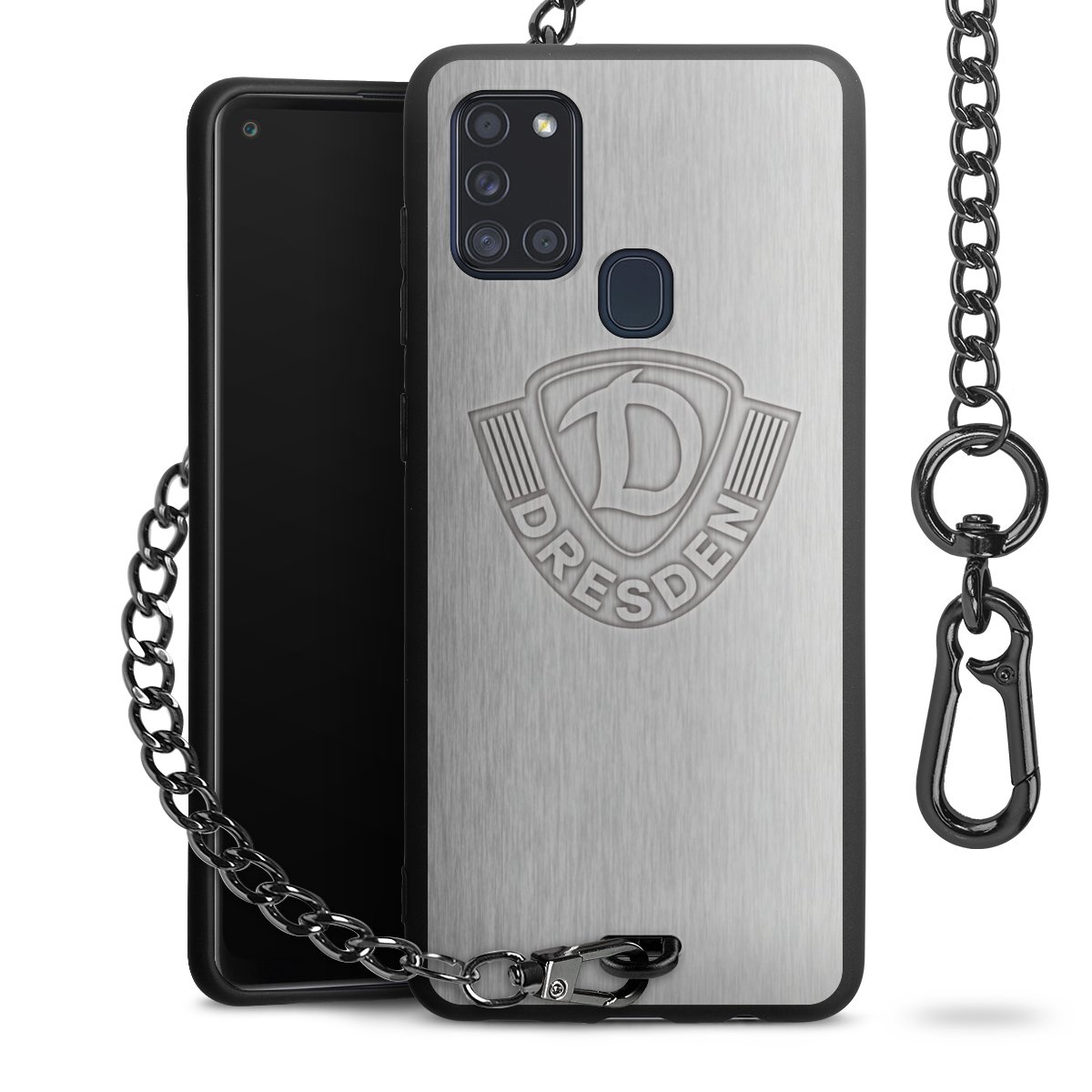 Die mattschwarze Silikon-Handyhülle besteht aus robustem TPU (thermoplastisches Polyurethan). Sie ist flexibel und schützt Dein Smartphone vor Stößen und Kratzern. Die Kette sowie der Karabinerhaken sind aus Metall in Gunmetal-Optik gefertigt. Für dieses Produkt kommen ausschließlich TÜV-geprüfte Materialien zum Einsatz.