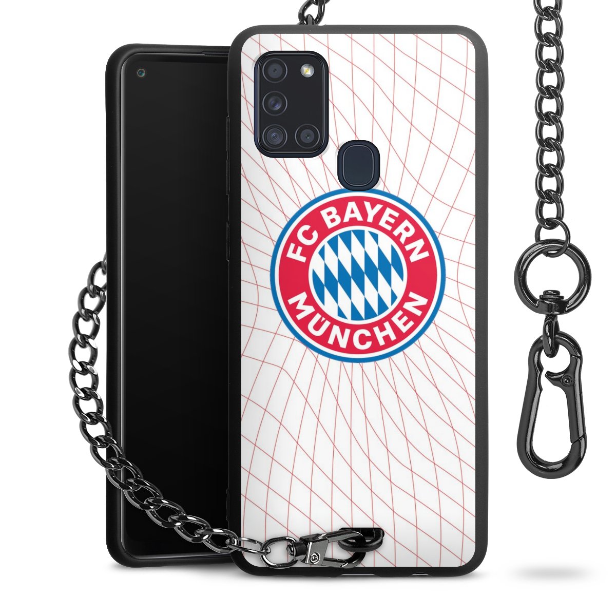 Die Handyhülle verfügt über eine mittig am unteren Rand platzierte Öse, an der die Metallkette stabil befestigt ist. Bestelle die Hülle einfach für Dein Smartphone-Modell, dann passt sie wie angegossen und Du brauchst sie bloß einmal anzudrücken. Handy in die Tasche, Karabiner an den Hosenbund – schon kann die Party starten.