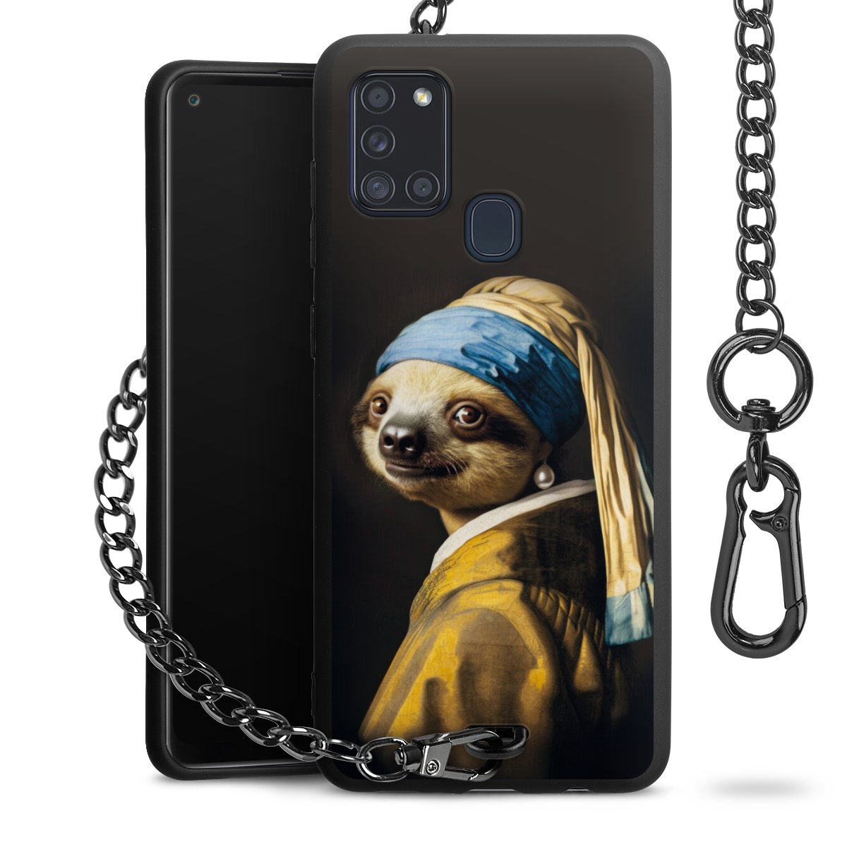Die Handyhülle verfügt über eine mittig am unteren Rand platzierte Öse, an der die Metallkette stabil befestigt ist. Bestelle die Hülle einfach für Dein Smartphone-Modell, dann passt sie wie angegossen und Du brauchst sie bloß einmal anzudrücken. Handy in die Tasche, Karabiner an den Hosenbund – schon kann die Party starten.