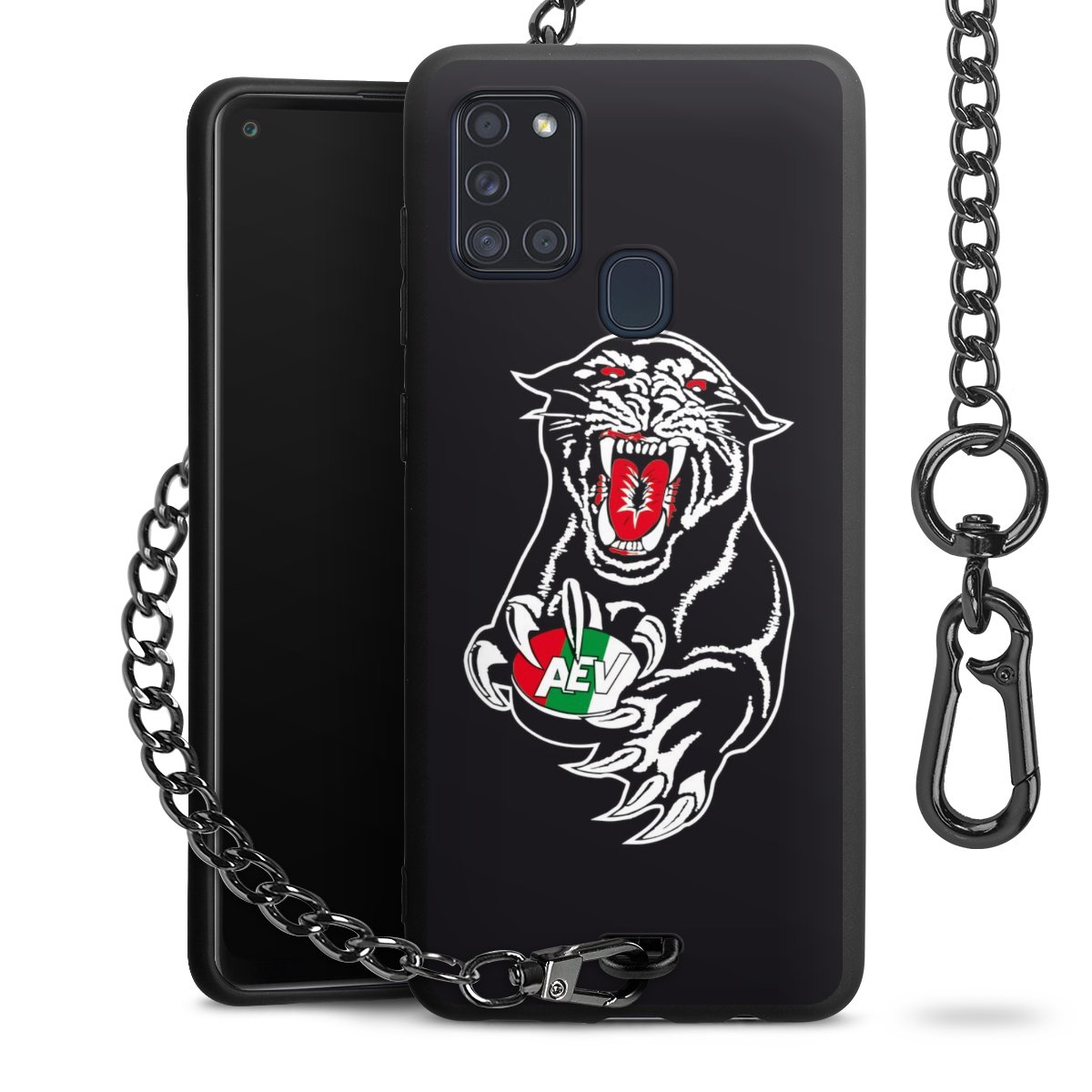Die mattschwarze Silikon-Handyhülle besteht aus robustem TPU (thermoplastisches Polyurethan). Sie ist flexibel und schützt Dein Smartphone vor Stößen und Kratzern. Die Kette sowie der Karabinerhaken sind aus Metall in Gunmetal-Optik gefertigt. Für dieses Produkt kommen ausschließlich TÜV-geprüfte Materialien zum Einsatz.