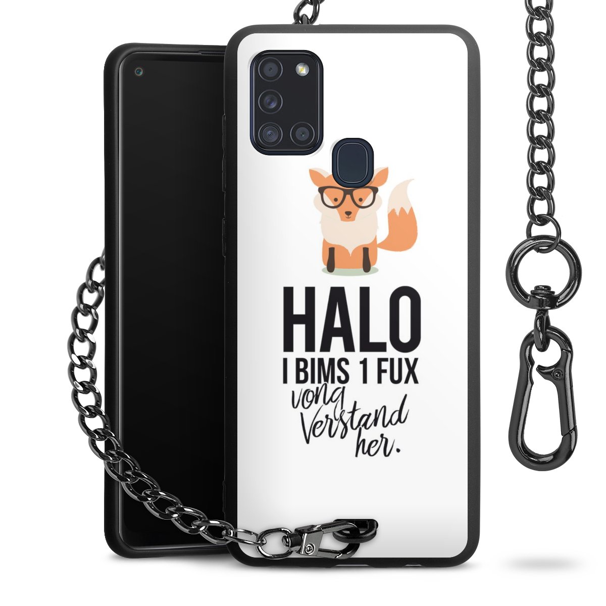 Die Handyhülle verfügt über eine mittig am unteren Rand platzierte Öse, an der die Metallkette stabil befestigt ist. Bestelle die Hülle einfach für Dein Smartphone-Modell, dann passt sie wie angegossen und Du brauchst sie bloß einmal anzudrücken. Handy in die Tasche, Karabiner an den Hosenbund – schon kann die Party starten.