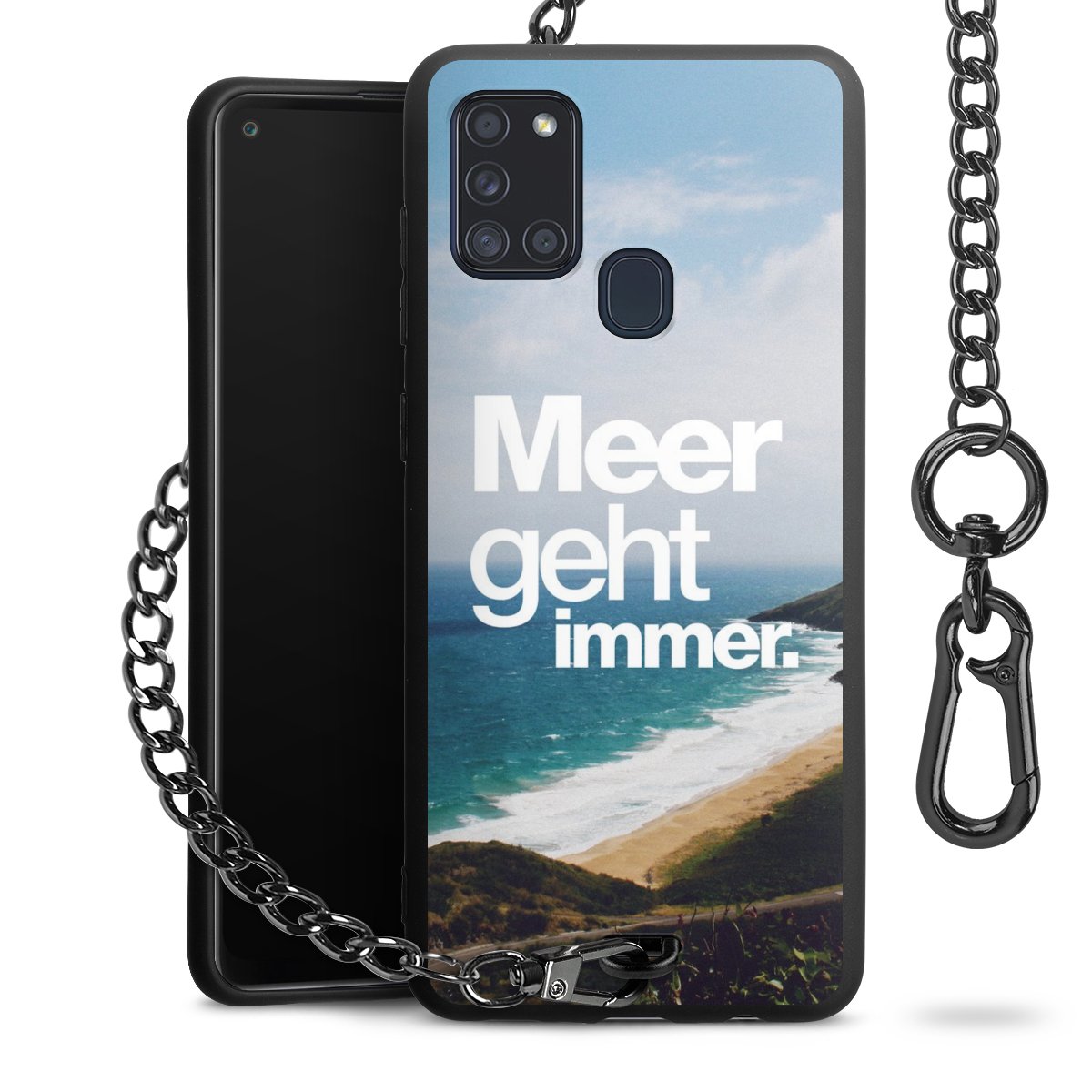 Die Handyhülle verfügt über eine mittig am unteren Rand platzierte Öse, an der die Metallkette stabil befestigt ist. Bestelle die Hülle einfach für Dein Smartphone-Modell, dann passt sie wie angegossen und Du brauchst sie bloß einmal anzudrücken. Handy in die Tasche, Karabiner an den Hosenbund – schon kann die Party starten.
