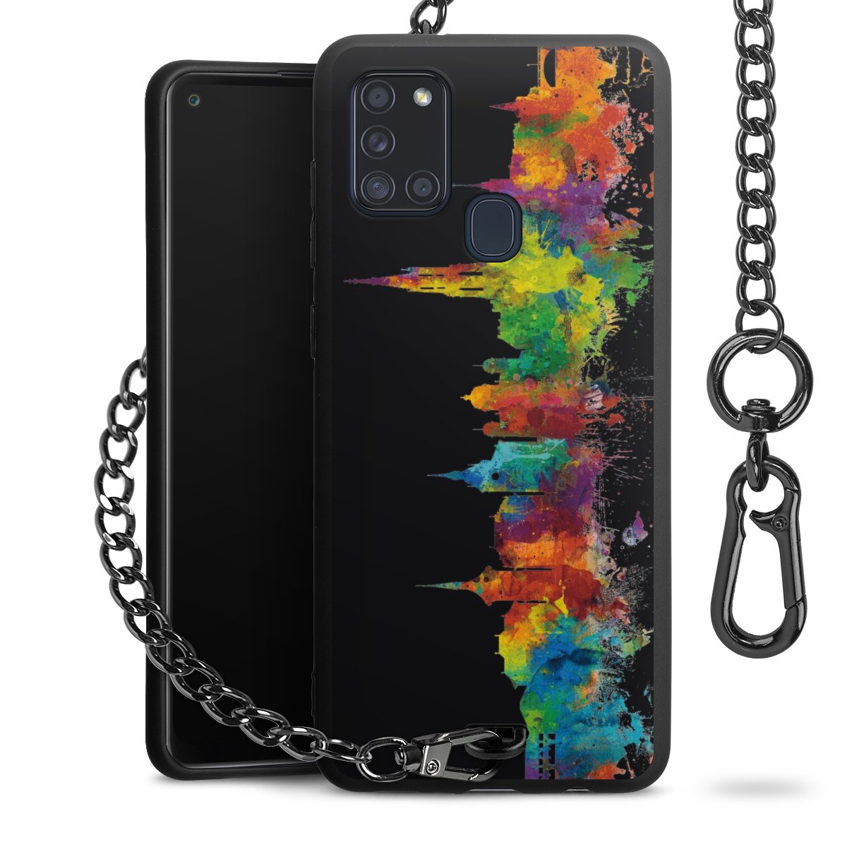 Die Handyhülle verfügt über eine mittig am unteren Rand platzierte Öse, an der die Metallkette stabil befestigt ist. Bestelle die Hülle einfach für Dein Smartphone-Modell, dann passt sie wie angegossen und Du brauchst sie bloß einmal anzudrücken. Handy in die Tasche, Karabiner an den Hosenbund – schon kann die Party starten.