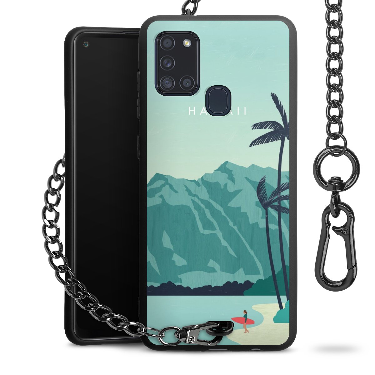 Die Handyhülle verfügt über eine mittig am unteren Rand platzierte Öse, an der die Metallkette stabil befestigt ist. Bestelle die Hülle einfach für Dein Smartphone-Modell, dann passt sie wie angegossen und Du brauchst sie bloß einmal anzudrücken. Handy in die Tasche, Karabiner an den Hosenbund – schon kann die Party starten.