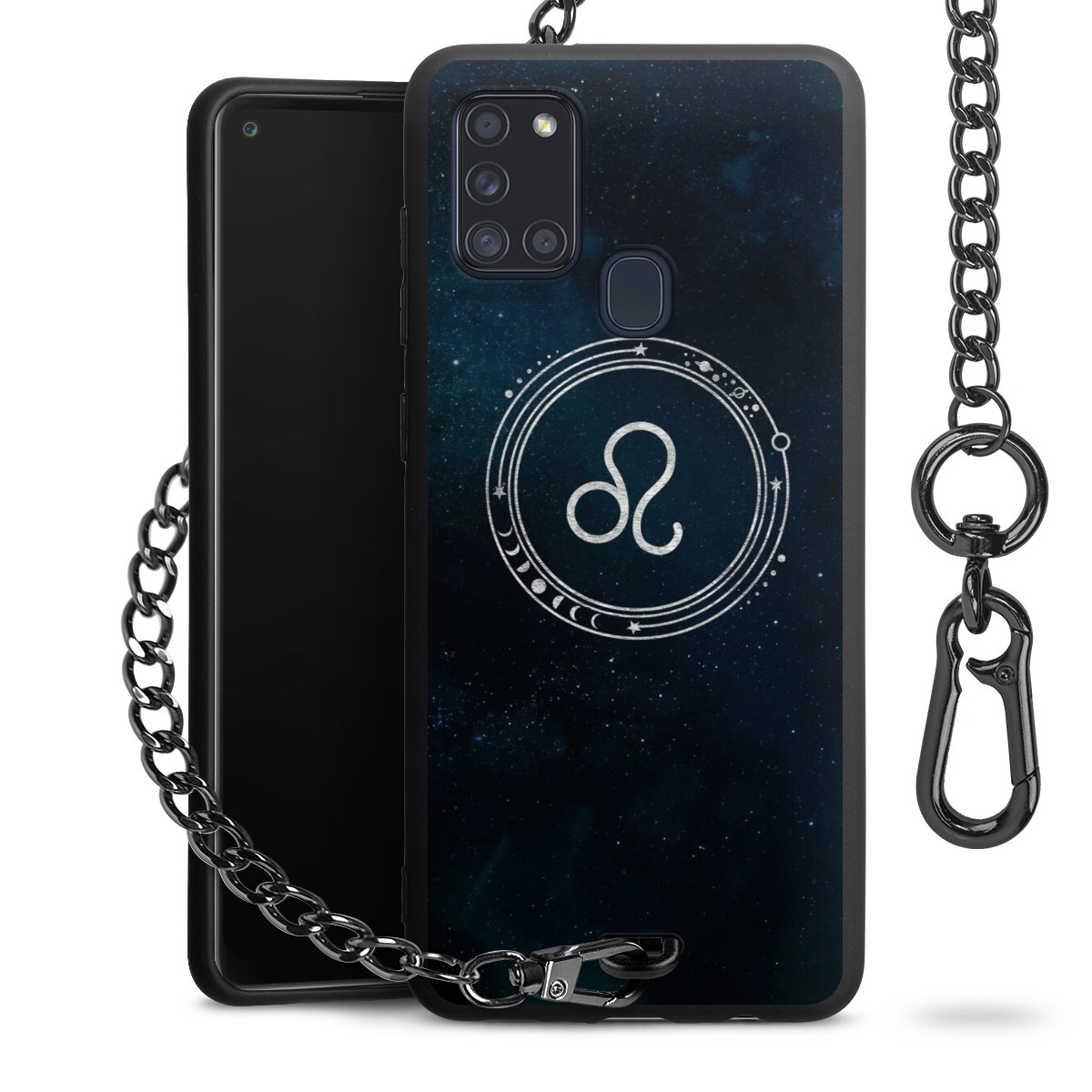 Die Handyhülle verfügt über eine mittig am unteren Rand platzierte Öse, an der die Metallkette stabil befestigt ist. Bestelle die Hülle einfach für Dein Smartphone-Modell, dann passt sie wie angegossen und Du brauchst sie bloß einmal anzudrücken. Handy in die Tasche, Karabiner an den Hosenbund – schon kann die Party starten.
