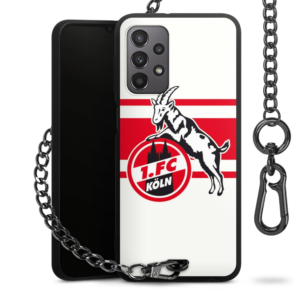 Die Handyhülle verfügt über eine mittig am unteren Rand platzierte Öse, an der die Metallkette stabil befestigt ist. Bestelle die Hülle einfach für Dein Smartphone-Modell, dann passt sie wie angegossen und Du brauchst sie bloß einmal anzudrücken. Handy in die Tasche, Karabiner an den Hosenbund – schon kann die Party starten.
