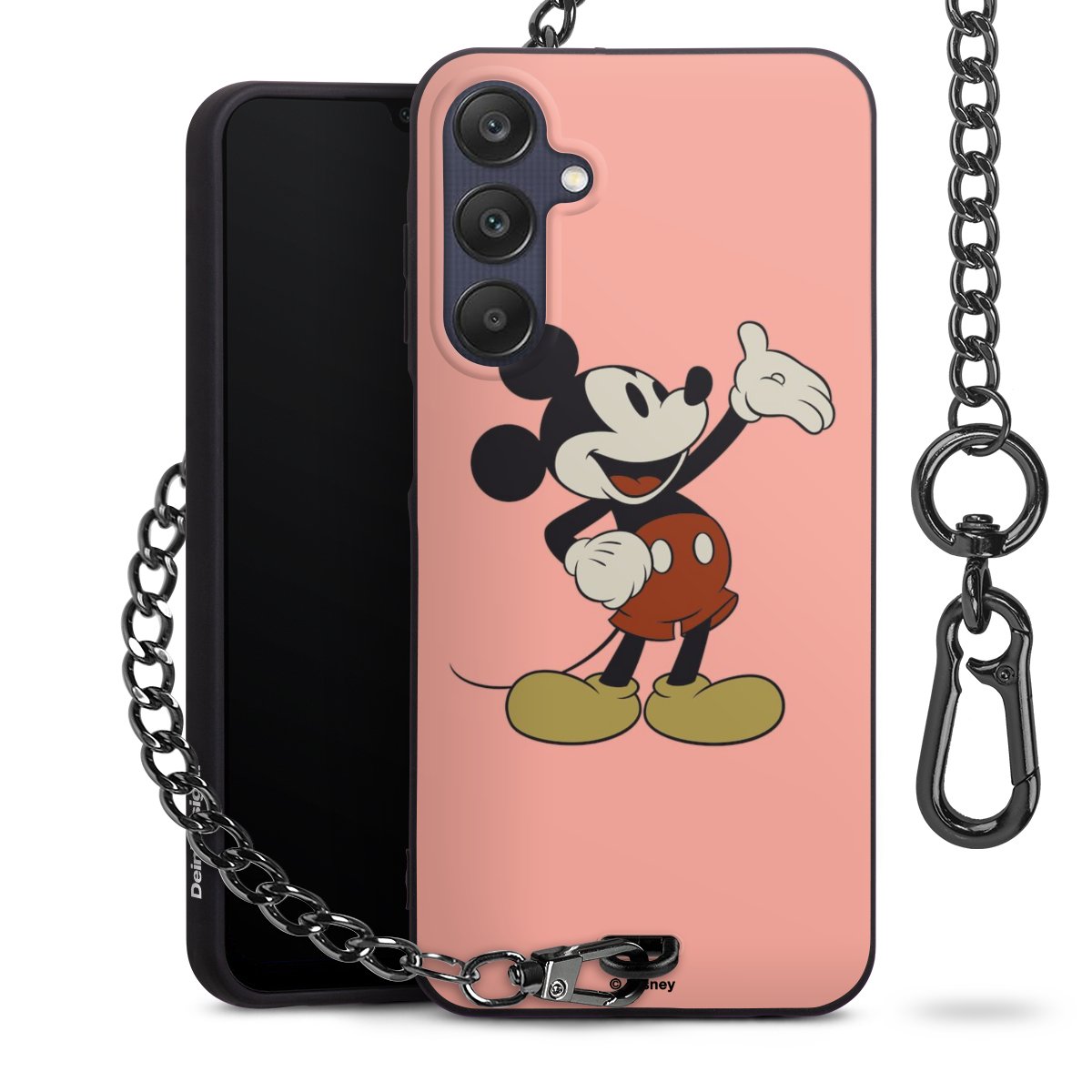 Die Handyhülle verfügt über eine mittig am unteren Rand platzierte Öse, an der die Metallkette stabil befestigt ist. Bestelle die Hülle einfach für Dein Smartphone-Modell, dann passt sie wie angegossen und Du brauchst sie bloß einmal anzudrücken. Handy in die Tasche, Karabiner an den Hosenbund – schon kann die Party starten.