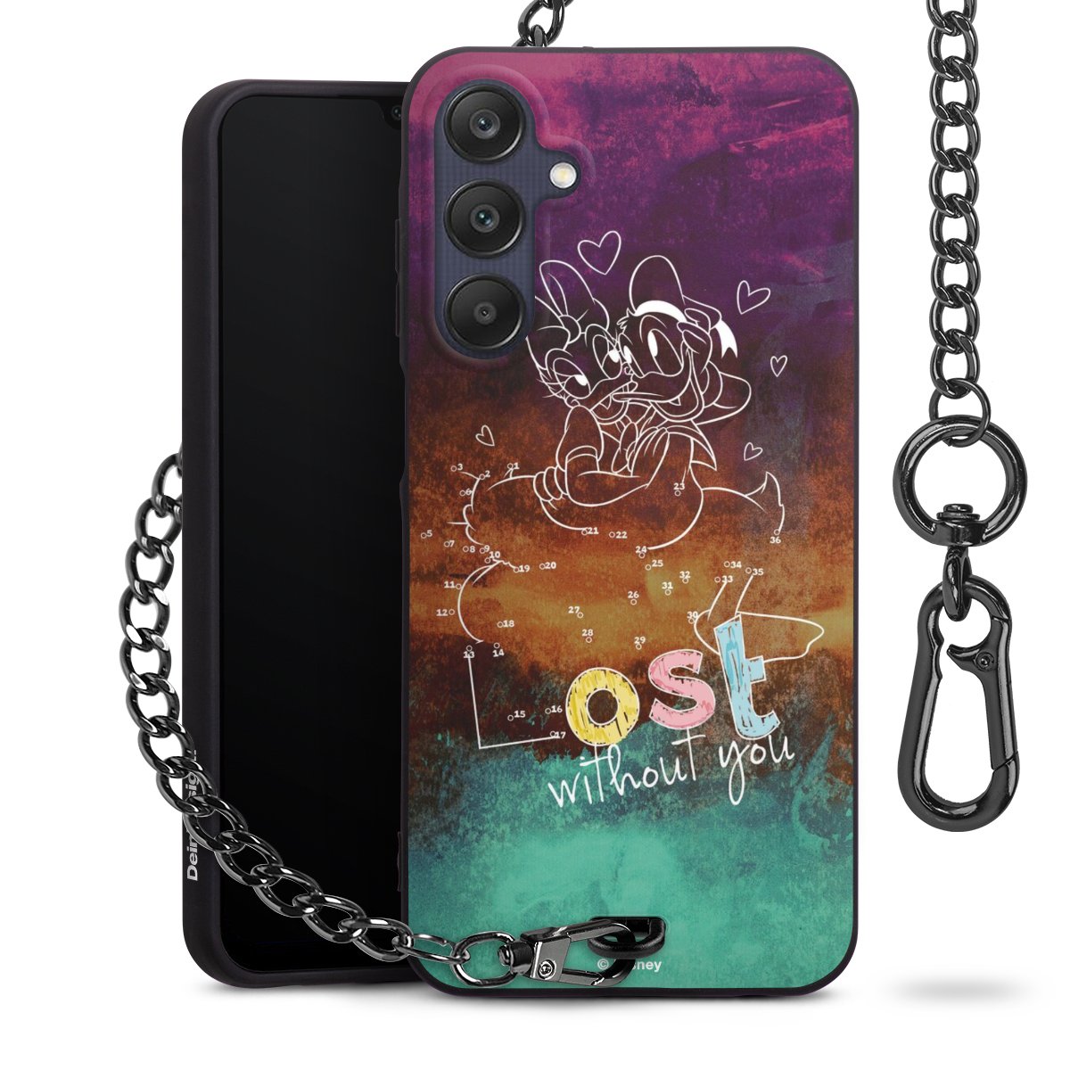 Die Handyhülle verfügt über eine mittig am unteren Rand platzierte Öse, an der die Metallkette stabil befestigt ist. Bestelle die Hülle einfach für Dein Smartphone-Modell, dann passt sie wie angegossen und Du brauchst sie bloß einmal anzudrücken. Handy in die Tasche, Karabiner an den Hosenbund – schon kann die Party starten.