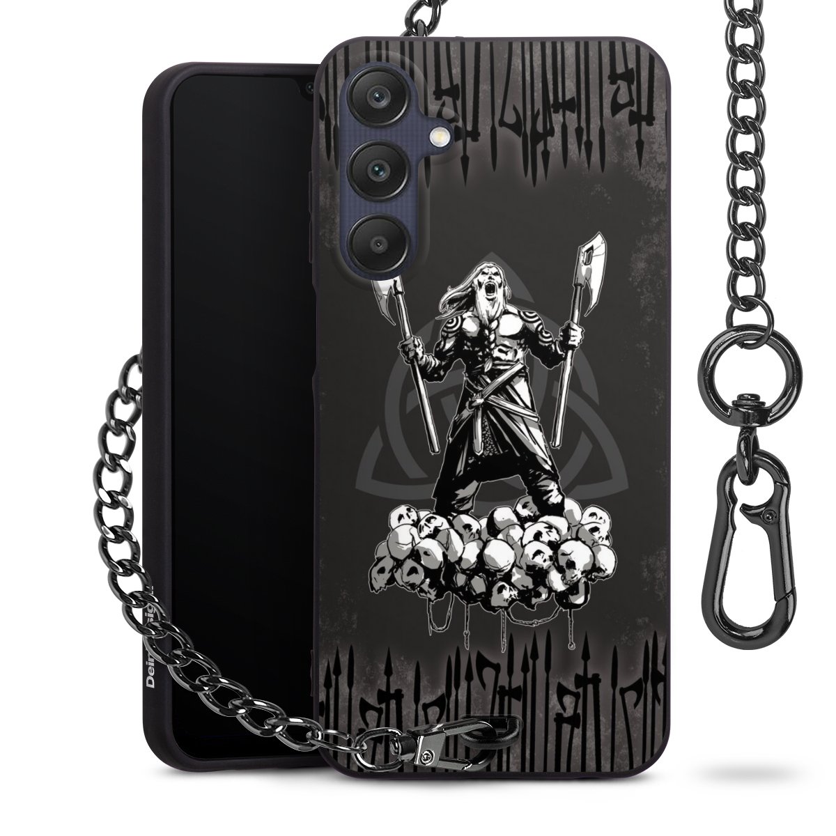 Die mattschwarze Silikon-Handyhülle besteht aus robustem TPU (thermoplastisches Polyurethan). Sie ist flexibel und schützt Dein Smartphone vor Stößen und Kratzern. Die Kette sowie der Karabinerhaken sind aus Metall in Gunmetal-Optik gefertigt. Für dieses Produkt kommen ausschließlich TÜV-geprüfte Materialien zum Einsatz.
