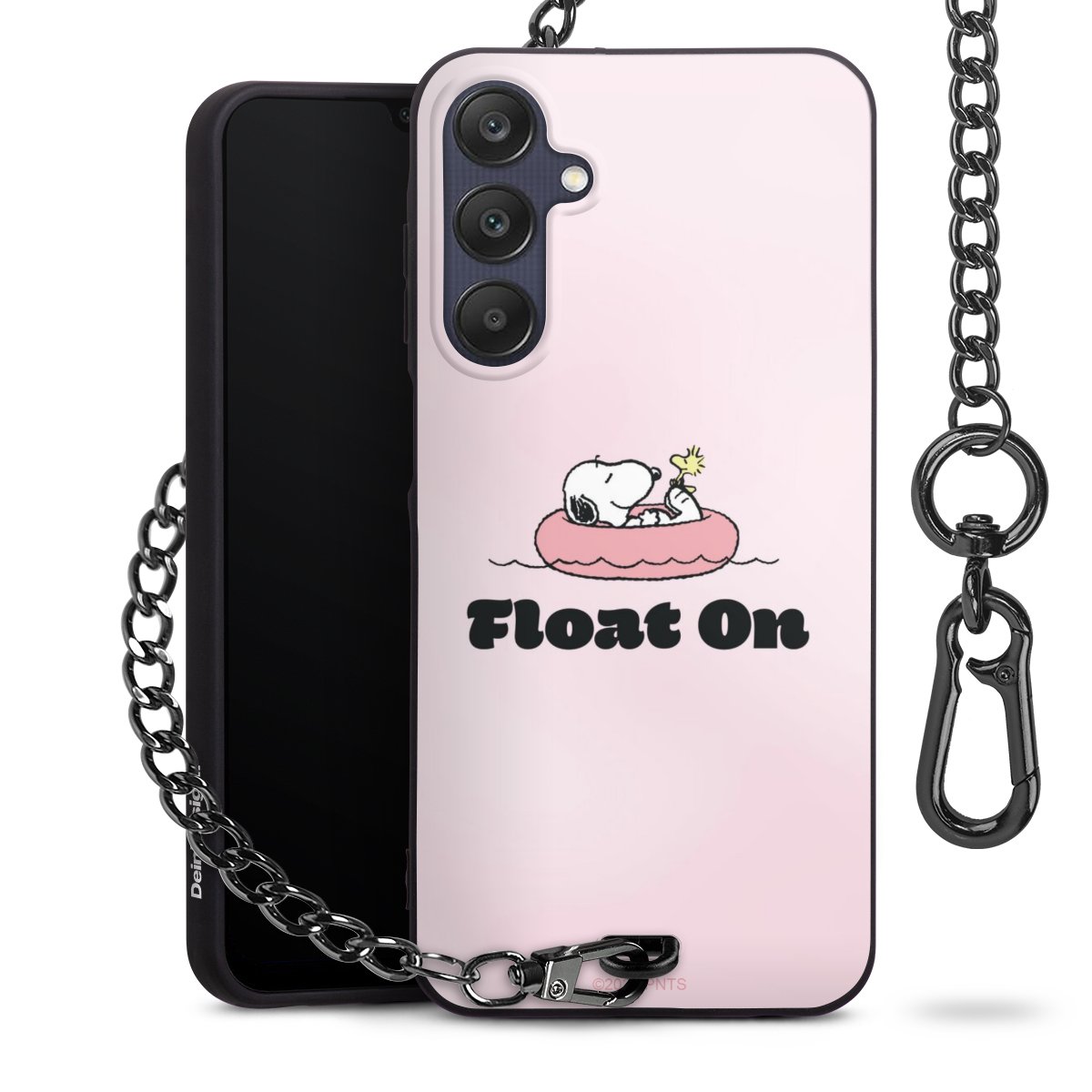 Die Handyhülle verfügt über eine mittig am unteren Rand platzierte Öse, an der die Metallkette stabil befestigt ist. Bestelle die Hülle einfach für Dein Smartphone-Modell, dann passt sie wie angegossen und Du brauchst sie bloß einmal anzudrücken. Handy in die Tasche, Karabiner an den Hosenbund – schon kann die Party starten.