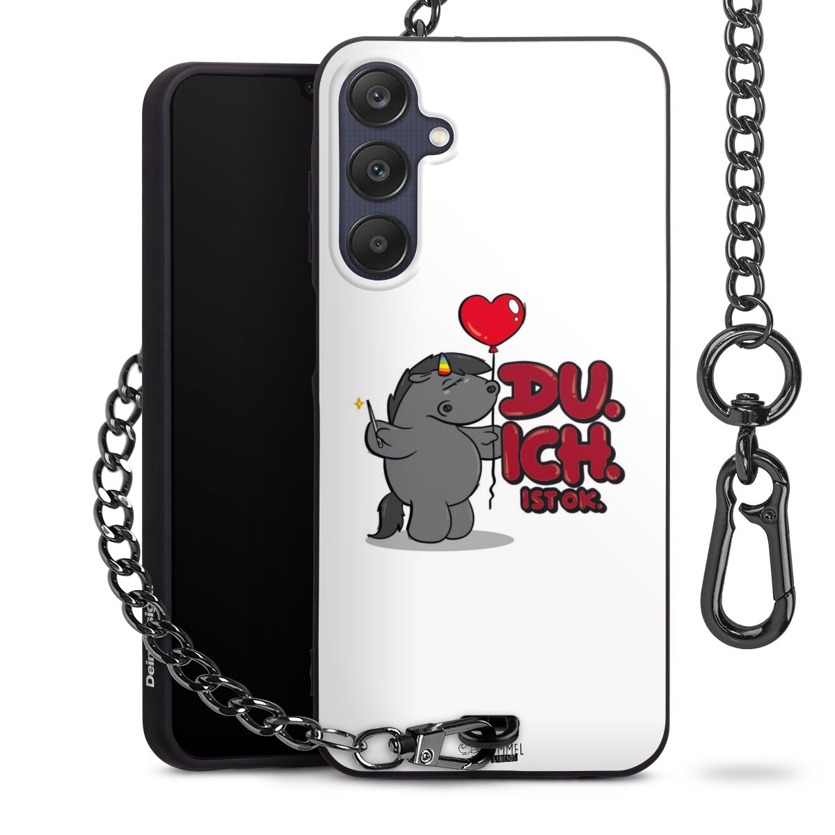 Die mattschwarze Silikon-Handyhülle besteht aus robustem TPU (thermoplastisches Polyurethan). Sie ist flexibel und schützt Dein Smartphone vor Stößen und Kratzern. Die Kette sowie der Karabinerhaken sind aus Metall in Gunmetal-Optik gefertigt. Für dieses Produkt kommen ausschließlich TÜV-geprüfte Materialien zum Einsatz.