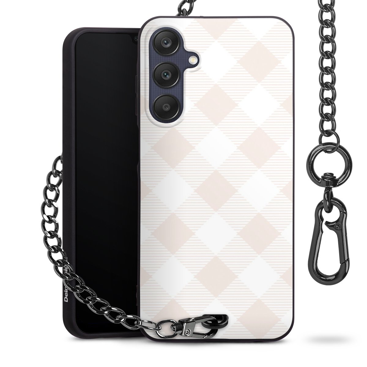 Die mattschwarze Silikon-Handyhülle besteht aus robustem TPU (thermoplastisches Polyurethan). Sie ist flexibel und schützt Dein Smartphone vor Stößen und Kratzern. Die Kette sowie der Karabinerhaken sind aus Metall in Gunmetal-Optik gefertigt. Für dieses Produkt kommen ausschließlich TÜV-geprüfte Materialien zum Einsatz.