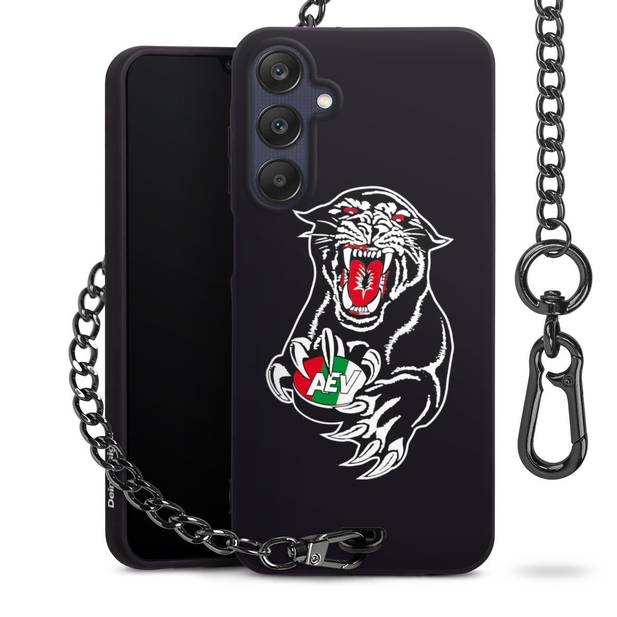 Die mattschwarze Silikon-Handyhülle besteht aus robustem TPU (thermoplastisches Polyurethan). Sie ist flexibel und schützt Dein Smartphone vor Stößen und Kratzern. Die Kette sowie der Karabinerhaken sind aus Metall in Gunmetal-Optik gefertigt. Für dieses Produkt kommen ausschließlich TÜV-geprüfte Materialien zum Einsatz.