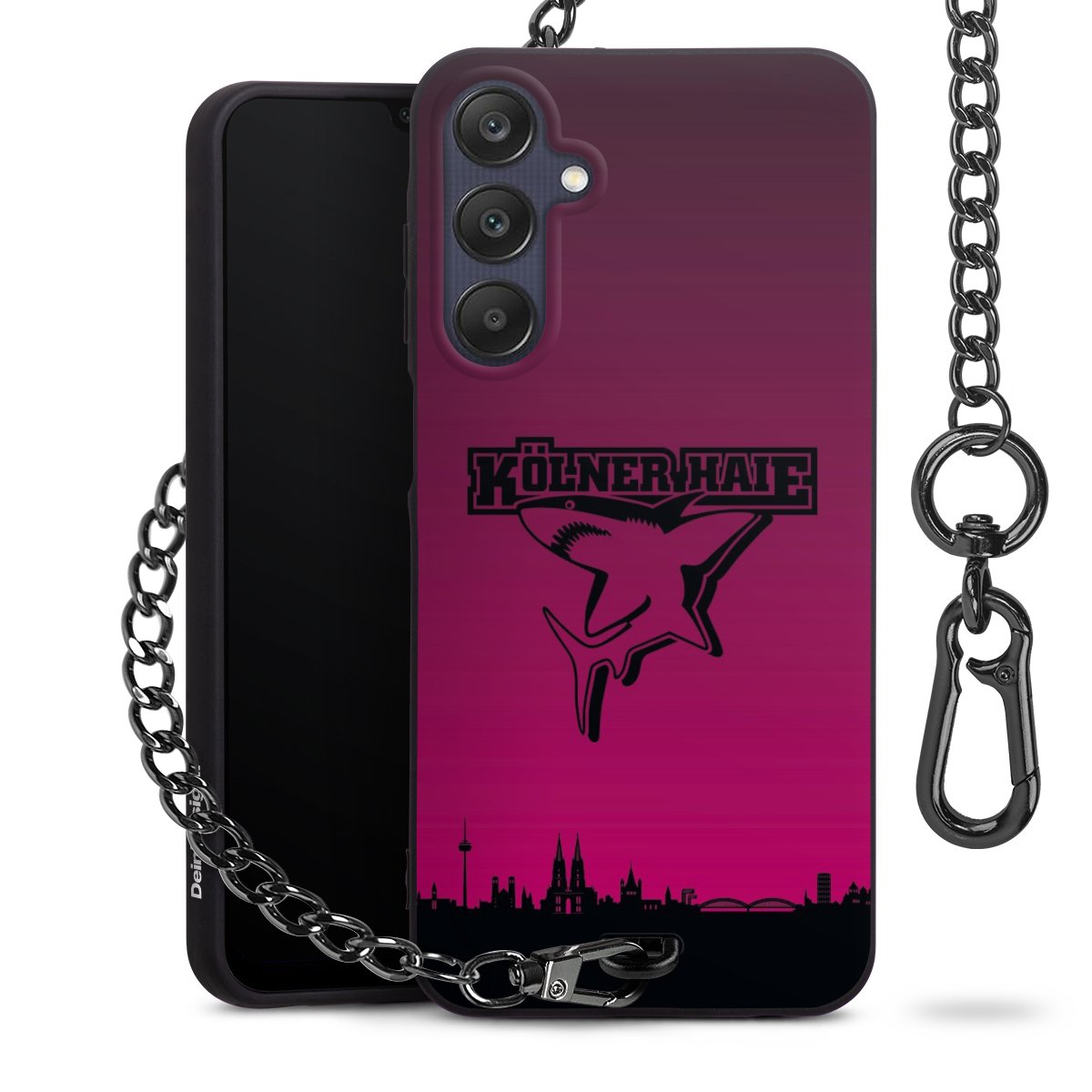 Die mattschwarze Silikon-Handyhülle besteht aus robustem TPU (thermoplastisches Polyurethan). Sie ist flexibel und schützt Dein Smartphone vor Stößen und Kratzern. Die Kette sowie der Karabinerhaken sind aus Metall in Gunmetal-Optik gefertigt. Für dieses Produkt kommen ausschließlich TÜV-geprüfte Materialien zum Einsatz.