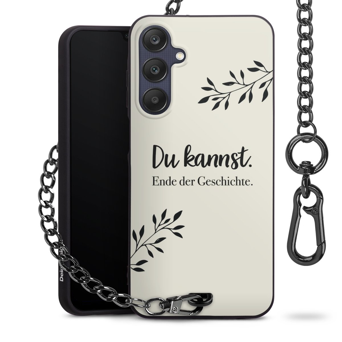 Die mattschwarze Silikon-Handyhülle besteht aus robustem TPU (thermoplastisches Polyurethan). Sie ist flexibel und schützt Dein Smartphone vor Stößen und Kratzern. Die Kette sowie der Karabinerhaken sind aus Metall in Gunmetal-Optik gefertigt. Für dieses Produkt kommen ausschließlich TÜV-geprüfte Materialien zum Einsatz.