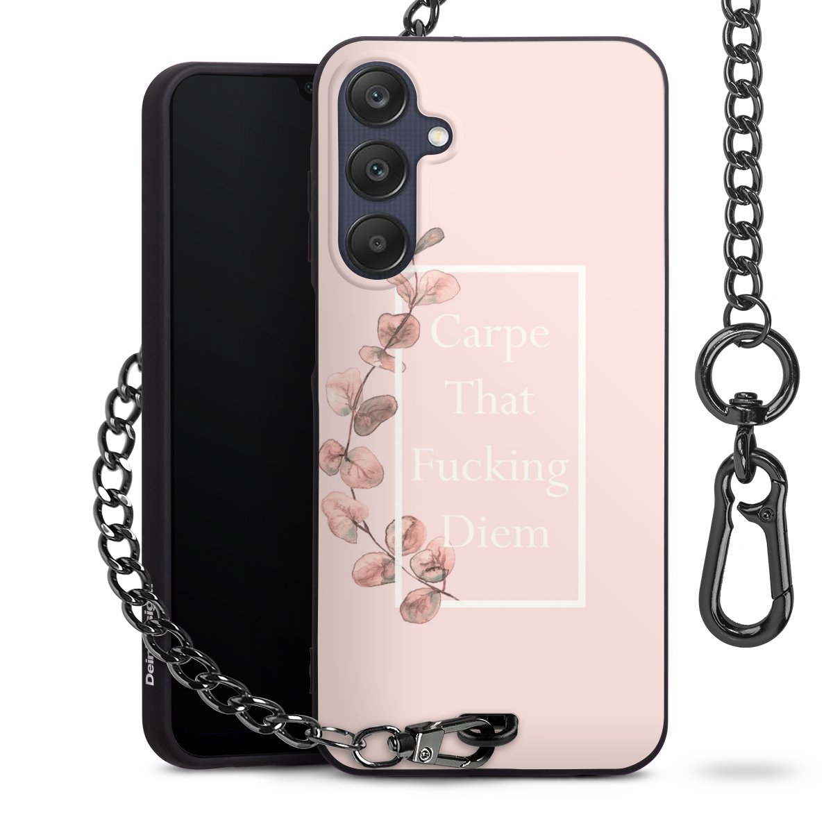 Die Handyhülle verfügt über eine mittig am unteren Rand platzierte Öse, an der die Metallkette stabil befestigt ist. Bestelle die Hülle einfach für Dein Smartphone-Modell, dann passt sie wie angegossen und Du brauchst sie bloß einmal anzudrücken. Handy in die Tasche, Karabiner an den Hosenbund – schon kann die Party starten.
