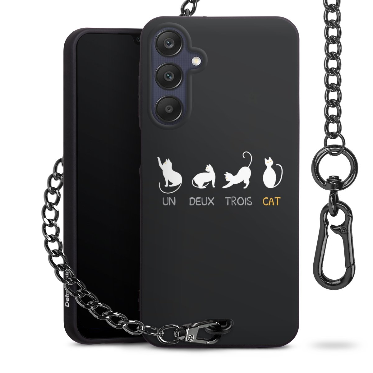 Die mattschwarze Silikon-Handyhülle besteht aus robustem TPU (thermoplastisches Polyurethan). Sie ist flexibel und schützt Dein Smartphone vor Stößen und Kratzern. Die Kette sowie der Karabinerhaken sind aus Metall in Gunmetal-Optik gefertigt. Für dieses Produkt kommen ausschließlich TÜV-geprüfte Materialien zum Einsatz.