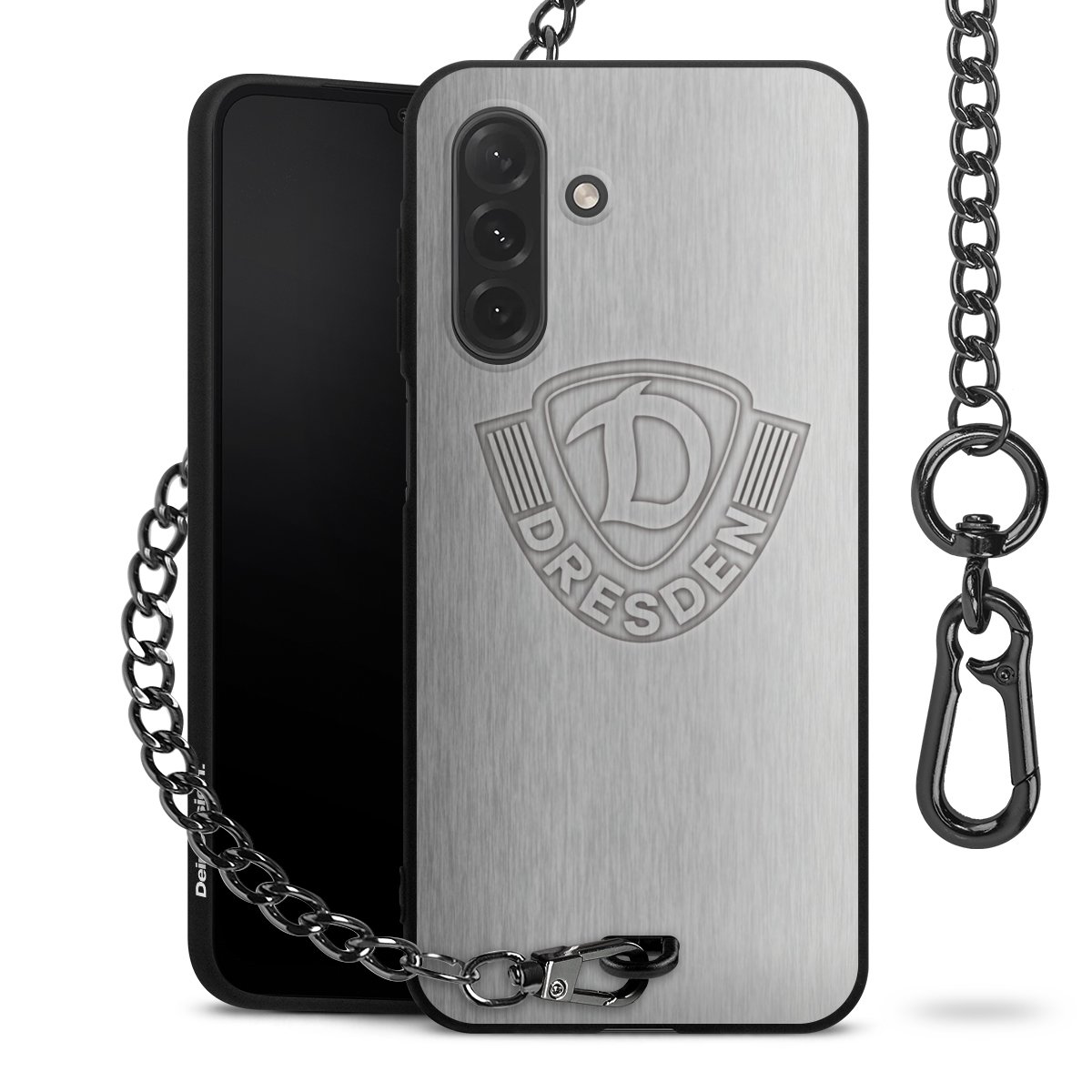 Die mattschwarze Silikon-Handyhülle besteht aus robustem TPU (thermoplastisches Polyurethan). Sie ist flexibel und schützt Dein Smartphone vor Stößen und Kratzern. Die Kette sowie der Karabinerhaken sind aus Metall in Gunmetal-Optik gefertigt. Für dieses Produkt kommen ausschließlich TÜV-geprüfte Materialien zum Einsatz.